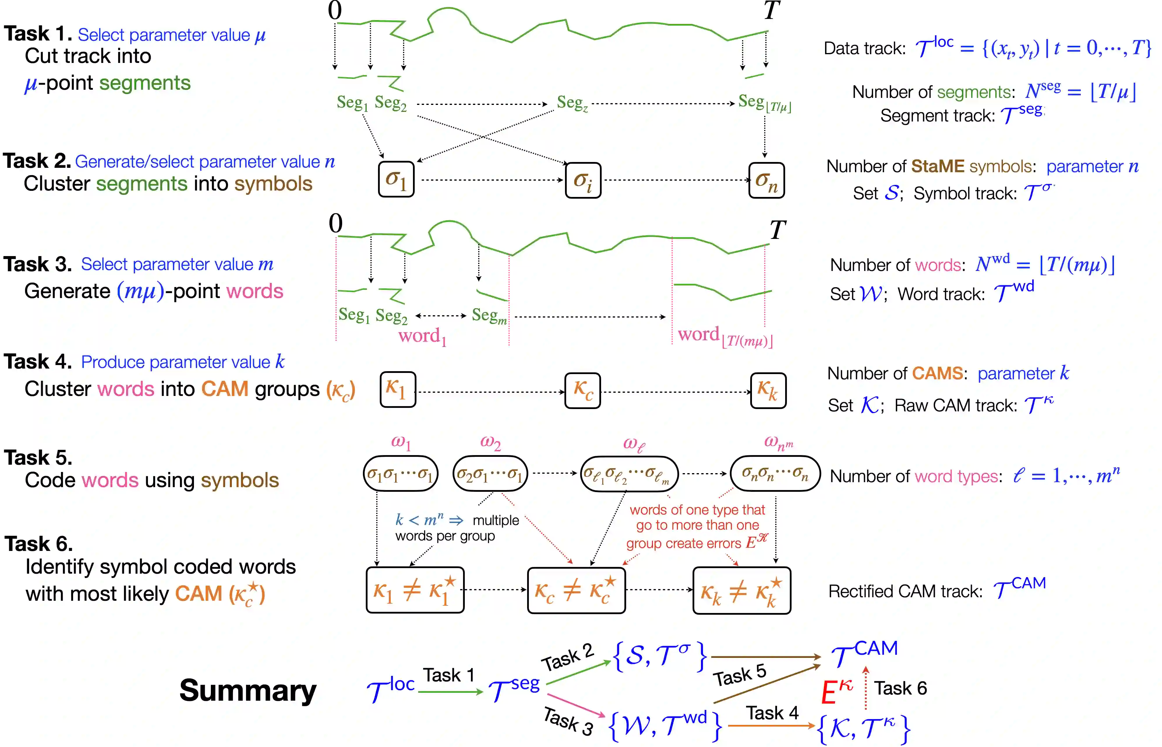 The two-dimensional track of an animal on a landscape has progressed over the past three decades from hourly to second-by-second recordings of locations. Track segmentation methods for analyzing the behavioral information in such relocation data has lagged somewhat behind, with scales of analysis currently at the sub-hourly to minute level. A new approach is needed to bring segmentation analysis down to a second-by-second level. Here, such an approach is presented that rests heavily on concepts from Shannon's Information Theory. In this paper, we first briefly review and update concepts relating to movement path segmentation. We then discuss how cluster analysis can be used to organize the smallest viable statistical movement elements (StaMEs), which are $\mu$ steps long, and to code the next level of movement elements called ``words'' that are $m \mu$ steps long. Centroids of these word clusters are identified as canonical activity modes (CAMs). Unlike current segmentation schemes, the approach presented here allows us to provide entropy measures for movement paths, compute the coding efficiencies of derived StaMEs and CAMs, and assess error rates in the allocation of strings of $m$ StaMEs to CAM types. In addition our approach allows us to employ the Jensen-Shannon divergence measure to assess and compare the best choices for the various parameters (number of steps in a StaME, number of StaME types, number of StaMEs in a word, number of CAM types), as well as the best clustering methods for generating segments that can then be used to interpret and predict sequences of higher order segments. The theory presented here provides another tool in our toolbox for dealing with the effects of global change on the movement and redistribution of animals across altered landscapes