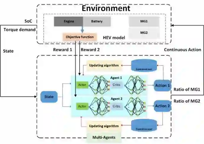 翻译:未来的运输系统将是一个多试剂网络,连接的AI代理商可以在这个网络中共同应对我们这个时代的重大挑战,例如减少真实世界驱动能源消费。与现有的关于车辆能源管理的研究(将多种投入和多种产出(MIIMO)控制分离为单产出控制)不同,本文件研究了一个多试剂深度强化学习框架,以同时处理多种控制产出。为DRL代理商提出了新的手工冲洗战略,引入了独立比率,并进行了参数学研究,以获得MADRL框架的最佳环境。该研究表明,0.2的独立比率的MADRL是最好的,超过2.4%的能源可以在常规DRL框架中保存。