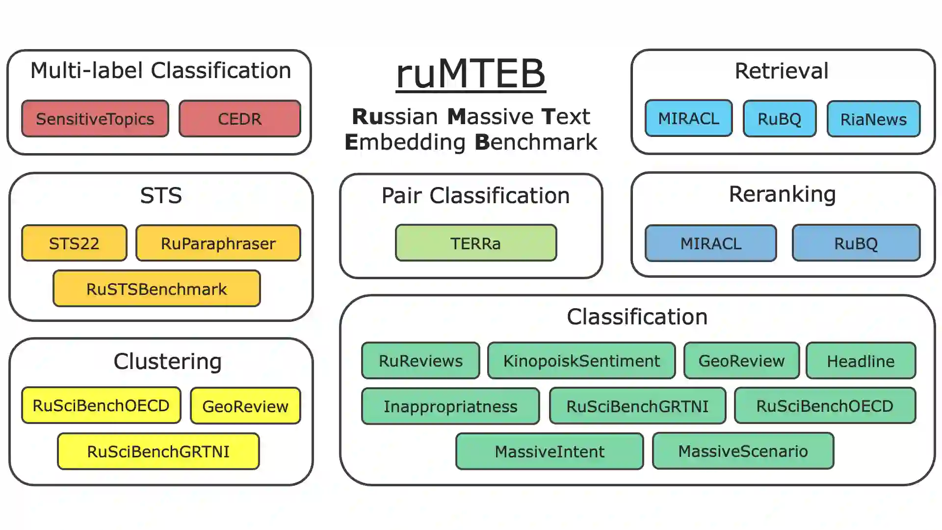 Embedding models play a crucial role in Natural Language Processing (NLP) by creating text embeddings used in various tasks such as information retrieval and assessing semantic text similarity. This paper focuses on research related to embedding models in the Russian language. It introduces a new Russian-focused embedding model called ru-en-RoSBERTa and the ruMTEB benchmark, the Russian version extending the Massive Text Embedding Benchmark (MTEB). Our benchmark includes seven categories of tasks, such as semantic textual similarity, text classification, reranking, and retrieval. The research also assesses a representative set of Russian and multilingual models on the proposed benchmark. The findings indicate that the new model achieves results that are on par with state-of-the-art models in Russian. We release the model ru-en-RoSBERTa, and the ruMTEB framework comes with open-source code, integration into the original framework and a public leaderboard.