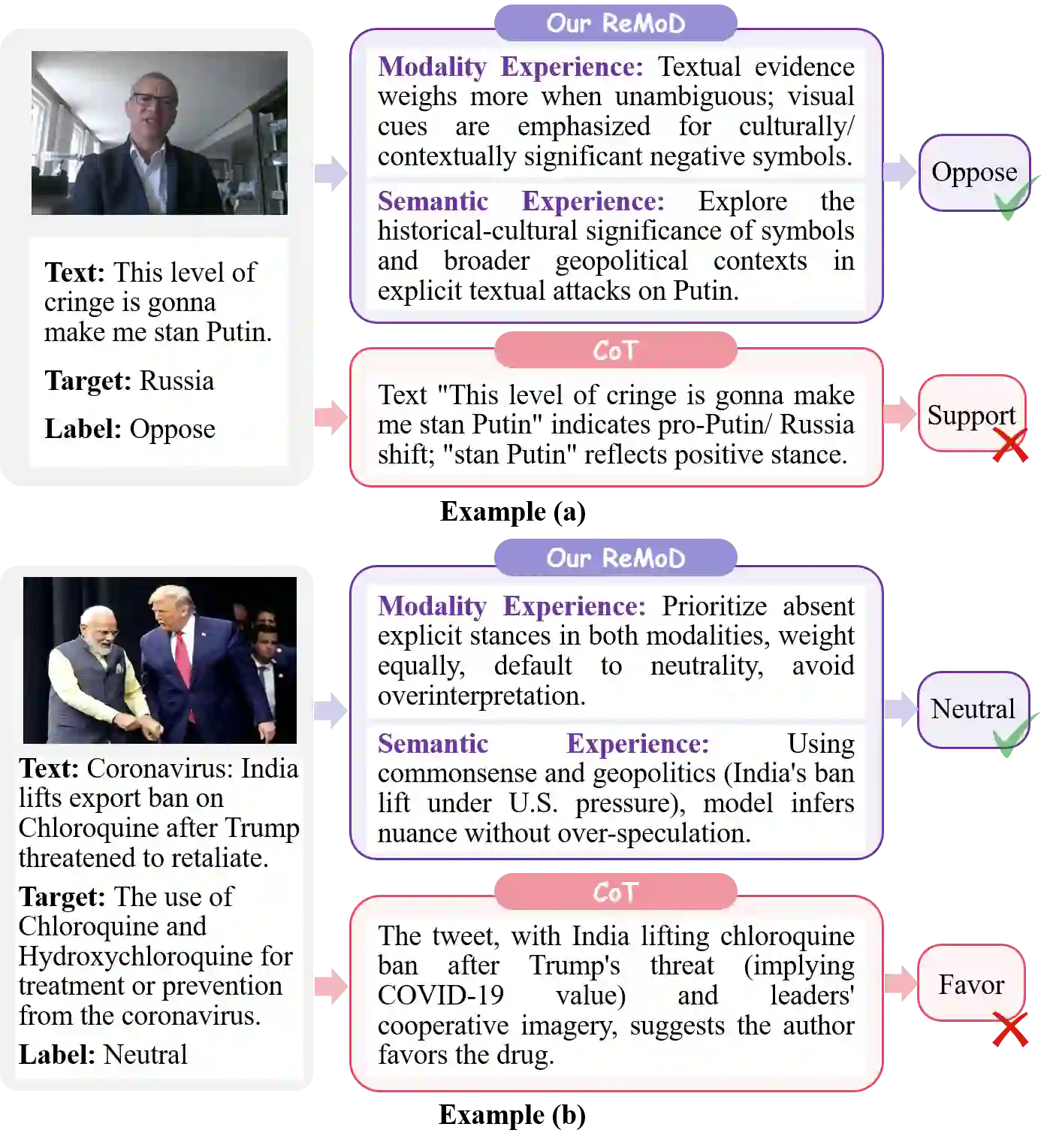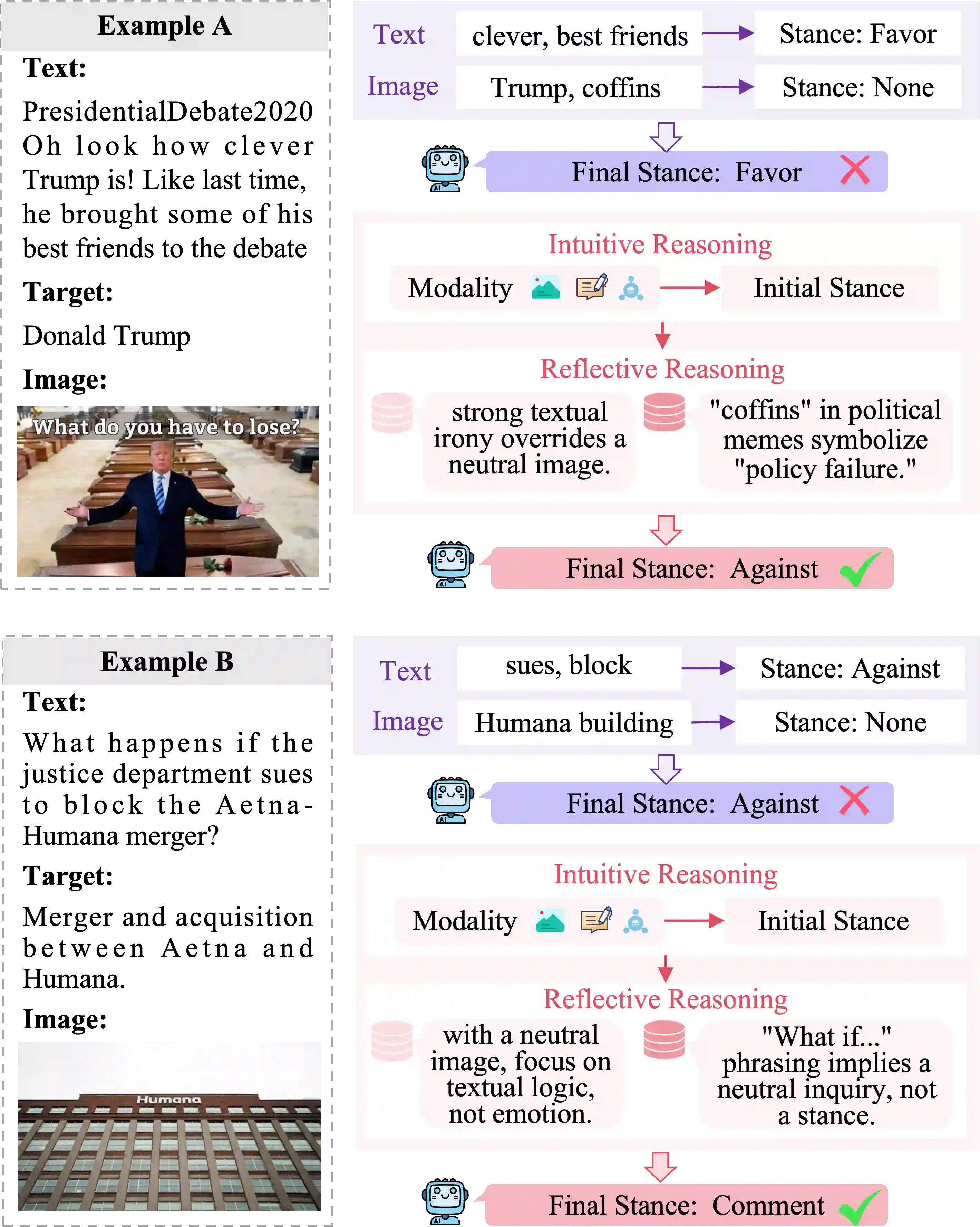 翻译:多模态立场检测(MSD)是理解社交媒体公众意见的关键任务。现有方法主要通过学**习模态融合**来运作,缺乏明确的推理过程来辨别模态间动态(如反讽或冲突)如何共同塑造用户的最终立场,导致频繁误判。为解决此问题,我们倡导从“学习融合”向“学习推理”的范式转变。我们提出**MIND**——一种用于双重推理的**元认知直觉-反思网络**。受人类认知双过程理论启发,MIND实现了一个自我改进的循环:首先通过查询动态演化的模态与语义经验池生成快速的直觉假设;随后,元认知反思阶段利用模态思维链(Modality-CoT)与语义思维链(Semantic-CoT)审视初始判断,提炼更优的自适应策略,并演进经验池本身。这两类经验结构在训练中持续优化,在推理时被召回以指导鲁棒且上下文感知的立场决策。在MMSD基准上的大量实验表明,我们的MIND模型显著优于多数基线模型,并展现出强大的泛化能力。