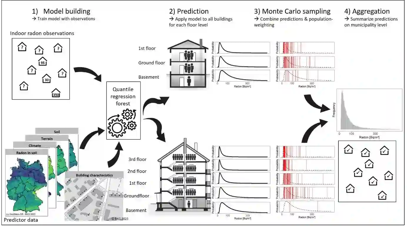 Radon is a carcinogenic, radioactive gas that can accumulate indoors. Therefore, accurate knowledge of indoor radon concentration is crucial for assessing radon-related health effects or identifying radon-prone areas. Indoor radon concentration at the national scale is usually estimated on the basis of extensive measurement campaigns. However, characteristics of the sample often differ from the characteristics of the population due to the large number of relevant factors that control the indoor radon concentration such as the availability of geogenic radon or floor level. Furthermore, the sample size usually does not allow estimation with high spatial resolution. We propose a model-based approach that allows a more realistic estimation of indoor radon distribution with a higher spatial resolution than a purely data-based approach. A two-stage modelling approach was applied: 1) a quantile regression forest using environmental and building data as predictors was applied to estimate the probability distribution function of indoor radon for each floor level of each residential building in Germany; (2) a probabilistic Monte Carlo sampling technique enabled the combination and population weighting of floor-level predictions. In this way, the uncertainty of the individual predictions is effectively propagated into the estimate of variability at the aggregated level. The results show an approximate lognormal distribution with an arithmetic mean of 63 Bq/m3, a geometric mean of 41 Bq/m3 and a 95 %ile of 180 Bq/m3. The exceedance probability for 100 Bq/m3 and 300 Bq/m3 are 12.5 % (10.5 million people) and 2.2 % (1.9 million people), respectively.