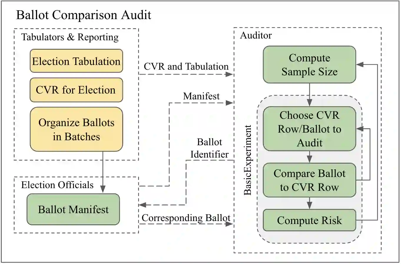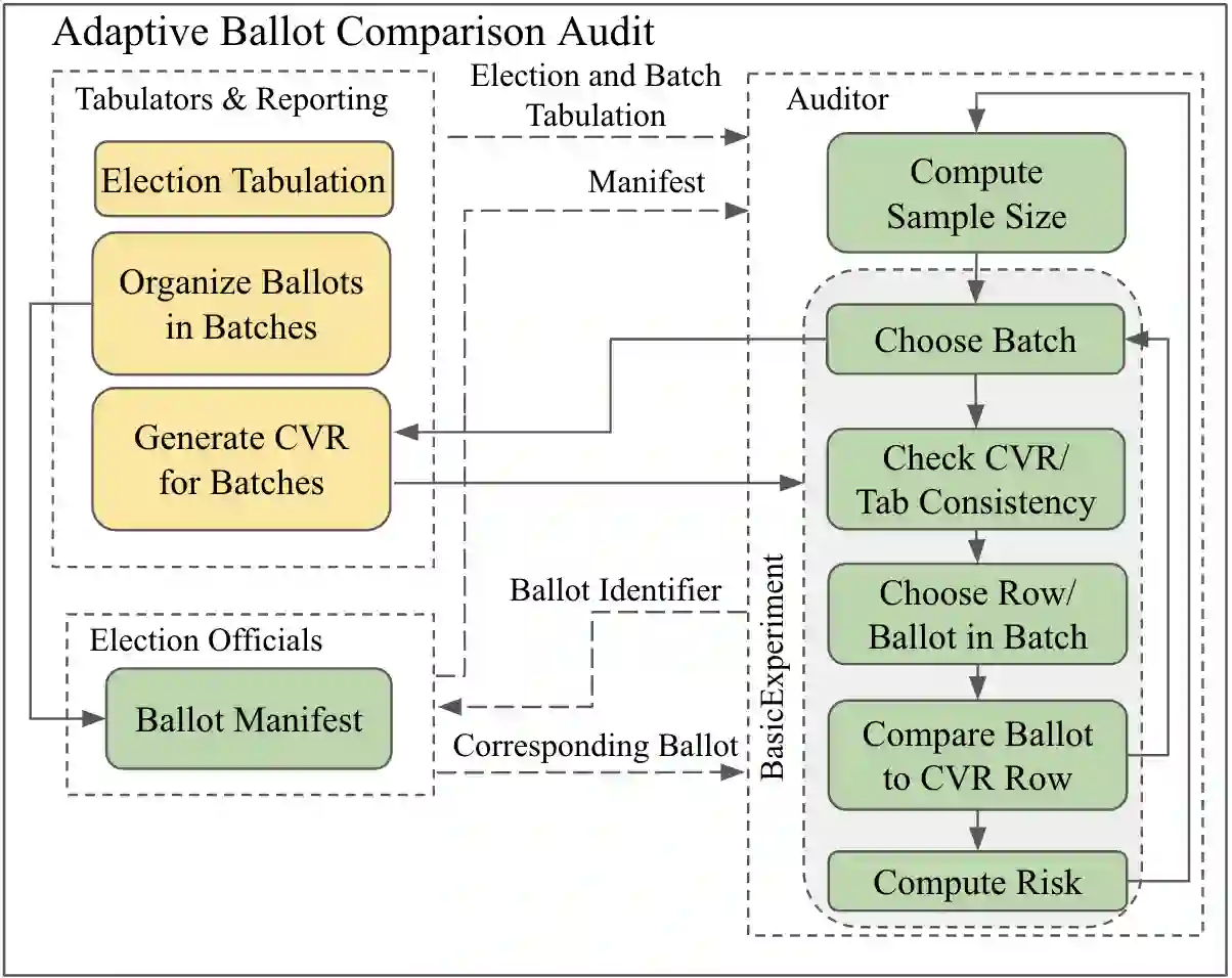 翻译:风险限制审计(RLAs)是用于检测无效选举结果的严格统计程序。在选举期间,RLAs检查在选举期间投出的纸面选票,以便从统计角度评估选票确定的获胜者与以制表方式报告的获胜者之间出现分歧的可能性。最高效的投票方法是“选票比较 ” 。然而,对选票进行比较需要不经信任地公布每张选票的内容,而不是简单的制表制选票总数。这个“轮投票记录表”(CVR)随后对选票进行抽查,以确保一致性。在许多实际环境中,产生合适的CVR的典型成本主导着进行审计的成本,防止广泛采用这些抽样效率技术。我们采用了新的RLA程序:“适应性投票比较”审计。在本次审计中,全球CVR从未产生;相反,一个三阶段程序是循环更新:1个批的样本,2个与该批相关的CVR的批数,2个CVR的批数的比值为5个选票,由审计员进行抽样检查,并与CVR的比值比较。我们证明在进行这样的审计时,一个符合审计的正确比率分析。