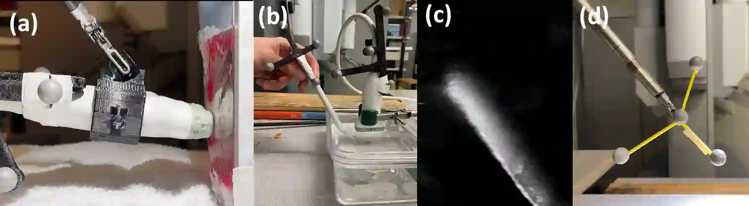 翻译:目的:移植基于术中超声的增强现实技术(AR)于经口腔机器人手术(TORS)能够提高手术的可视化效果和决策辅助。我们使用经颈道超声图像引导AR系统为TORS提供辅助,以提高手术安全和手术质量。方法:我们运用医学影像技术开发一种基于经颈道超声图像的AR系统,并进行MRI-transcervical 3D US配准,开发超声机-机器人校准方法以实时显示解剖模型。结果:我们的AR系统在水箱实验中平均投影误差为26.81和27.85像素。MRI到3D US的平均目标配准误差为8.90mm,手动3D US为5.85mm,管道中心线的平均距离为2.32mm。结论:我们证明了经颈道超声引导AR系统是TORS的一种有前景的图像引导技术,并且证明了经颈道超声诊断是TORS图像引导的可行技术。