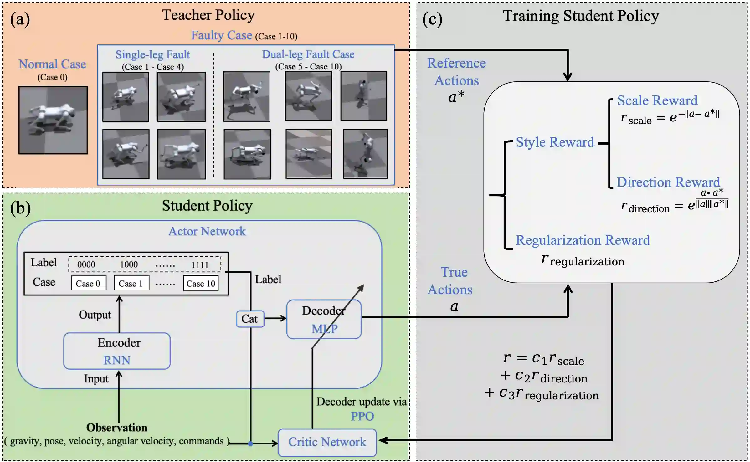 Quadrupedal robots can learn versatile locomotion skills but remain vulnerable when one or more joints lose power. In contrast, dogs and cats can adopt limping gaits when injured, demonstrating their remarkable ability to adapt to physical conditions. Inspired by such adaptability, this paper presents Action Learner (AcL), a novel teacher-student reinforcement learning framework that enables quadrupeds to autonomously adapt their gait for stable walking under multiple joint faults. Unlike conventional teacher-student approaches that enforce strict imitation, AcL leverages teacher policies to generate style rewards, guiding the student policy without requiring precise replication. We train multiple teacher policies, each corresponding to a different fault condition, and subsequently distill them into a single student policy with an encoder-decoder architecture. While prior works primarily address single-joint faults, AcL enables quadrupeds to walk with up to four faulty joints across one or two legs, autonomously switching between different limping gaits when faults occur. We validate AcL on a real Go2 quadruped robot under single- and double-joint faults, demonstrating fault-tolerant, stable walking, smooth gait transitions between normal and lamb gaits, and robustness against external disturbances.