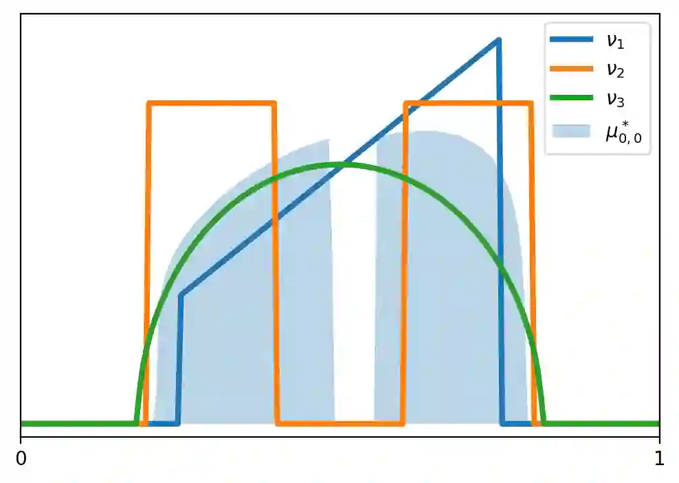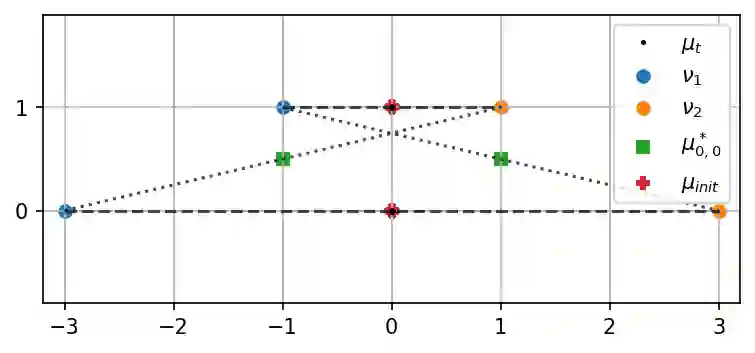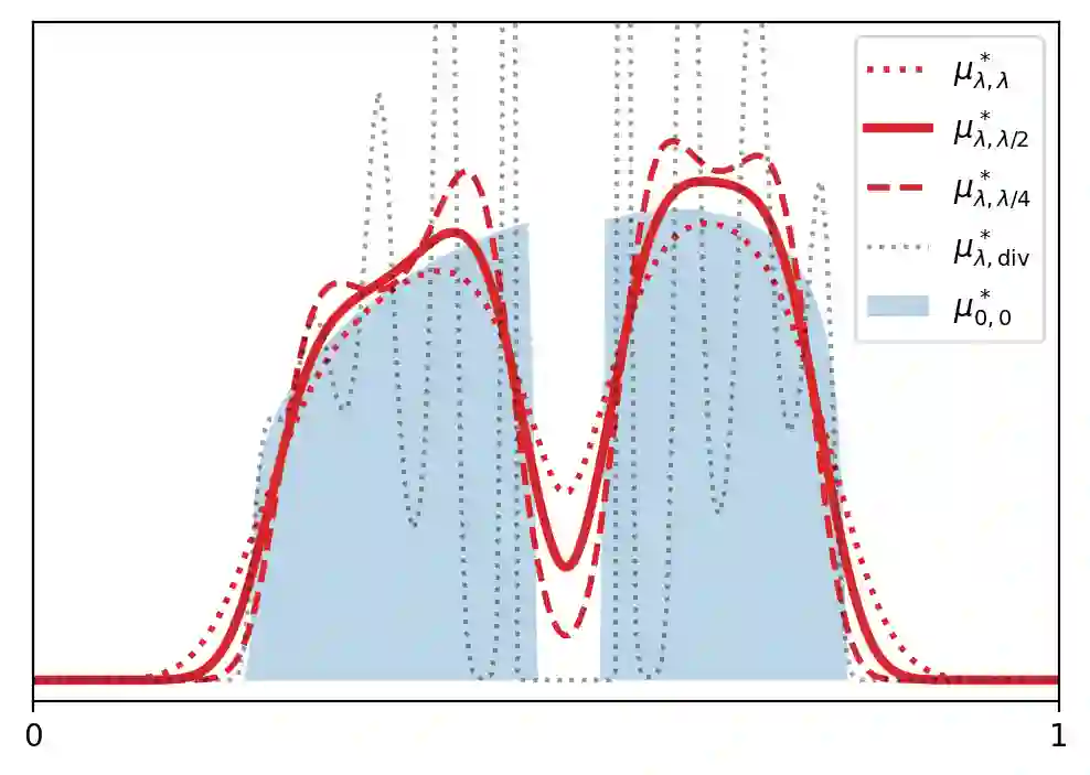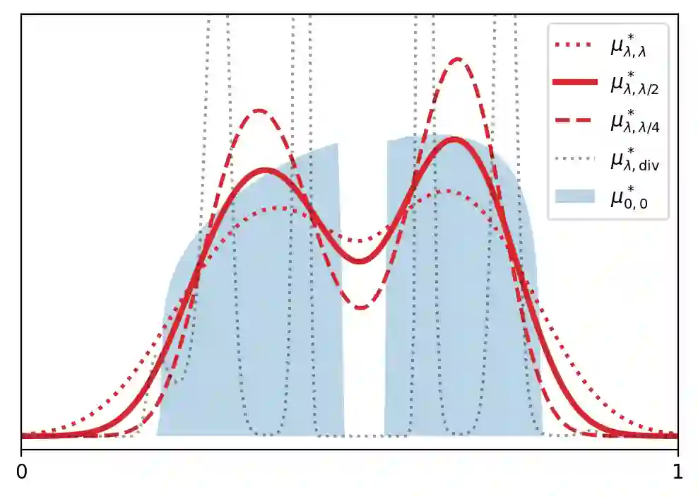 翻译:我们研究了一种正则化 Wasserstein barycenters 的通用公式,该公式具有有利的正则化、逼近、稳定性和(无网格)优化特性。该 barycenter 被定义为唯一的概率测度,它最小化了与一组给定概率测度相关的熵最优传输(EOT)成本之和,再加上熵项。我们将其表示为 $(\lambda,\tau)$-barycenter,其中 $\lambda$ 是内部正则化强度,$\tau$ 是外部正则化强度。这个公式恢复了以前提出的各种选择 $\lambda,\tau \geq 0$ 的 EOT barycenters,并将它们推广了。首先,我们证明了尽管它被 \emph{doubly} 正则化,但它对于 $\tau=\lambda/2$ 是未偏的:对于光滑密度,无(非正则化)Wasserstein barycenter 目标的次优性是熵正则化强度 $\lambda^2$ 的阶,而不是通常的 $\max\{\lambda,\tau\}$。我们讨论了各向同性高斯分布下的这种现象,其中所有 $(\lambda,\tau)$-barycenters 都具有封闭形式。其次,我们证明了对于 $\lambda,\tau>0$,这个 barycenter 具有平滑的密度,并且在边缘扰动下具有强稳定性。特别地,它可以被有效地估计:给定每个概率测量的 $n$ 个样本,它以速度 $n^{-1/2}$ 收敛于集合 barycenter 的相对熵率。最后,该公式自然地适用于基于网格的优化算法:我们提出了一个简单的 \emph{noisy particle gradient descent} 算法,在均场极限下,它全局指数速度收敛于 barycenter。