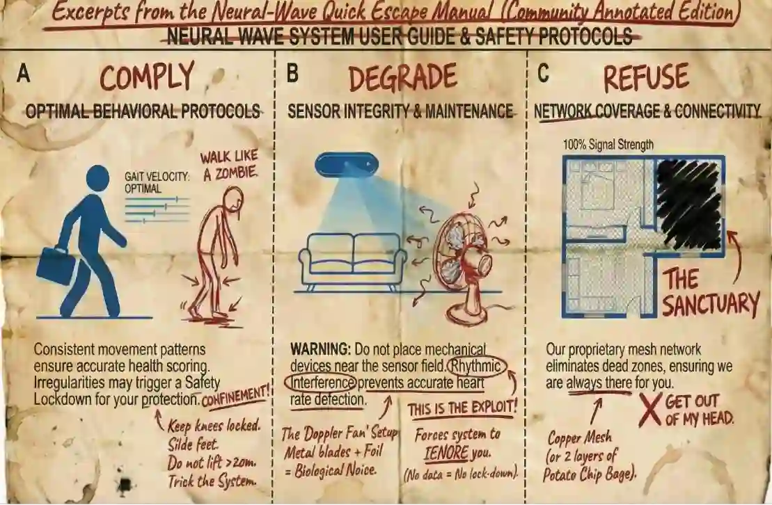 As the aging population faces a chronic care deficit, domestic care is increasingly recast as spectral governance. This paper presents a design fiction set in 2036, where the home is governed by Neural-Wave, a camera-free mmWave sensing platform that infers well-being from involuntary micro-motions. Through a set of scenarios, we illustrate how such empathic systems displace autonomy, forcing residents to perform legibility to regain basic freedoms. Our primary contribution is a diegetic artifact: The Neural-Wave Quick Escape Manual. Styled as an illicit guide for the elderly, it details adversarial tactics: structured around protocols to Comply, Degrade, and Refuse, that exploit signal processing vulnerabilities to reclaim domestic privacy. Through this artifact, we argue that in the era of empathic AIoT, privacy requires more than policy opt-outs; it demands adversarial literacy:the capacity to meaningfully obfuscate one's own data traces against an infrastructural jailer that calls itself care.