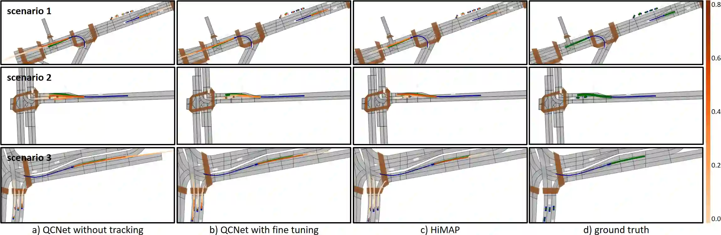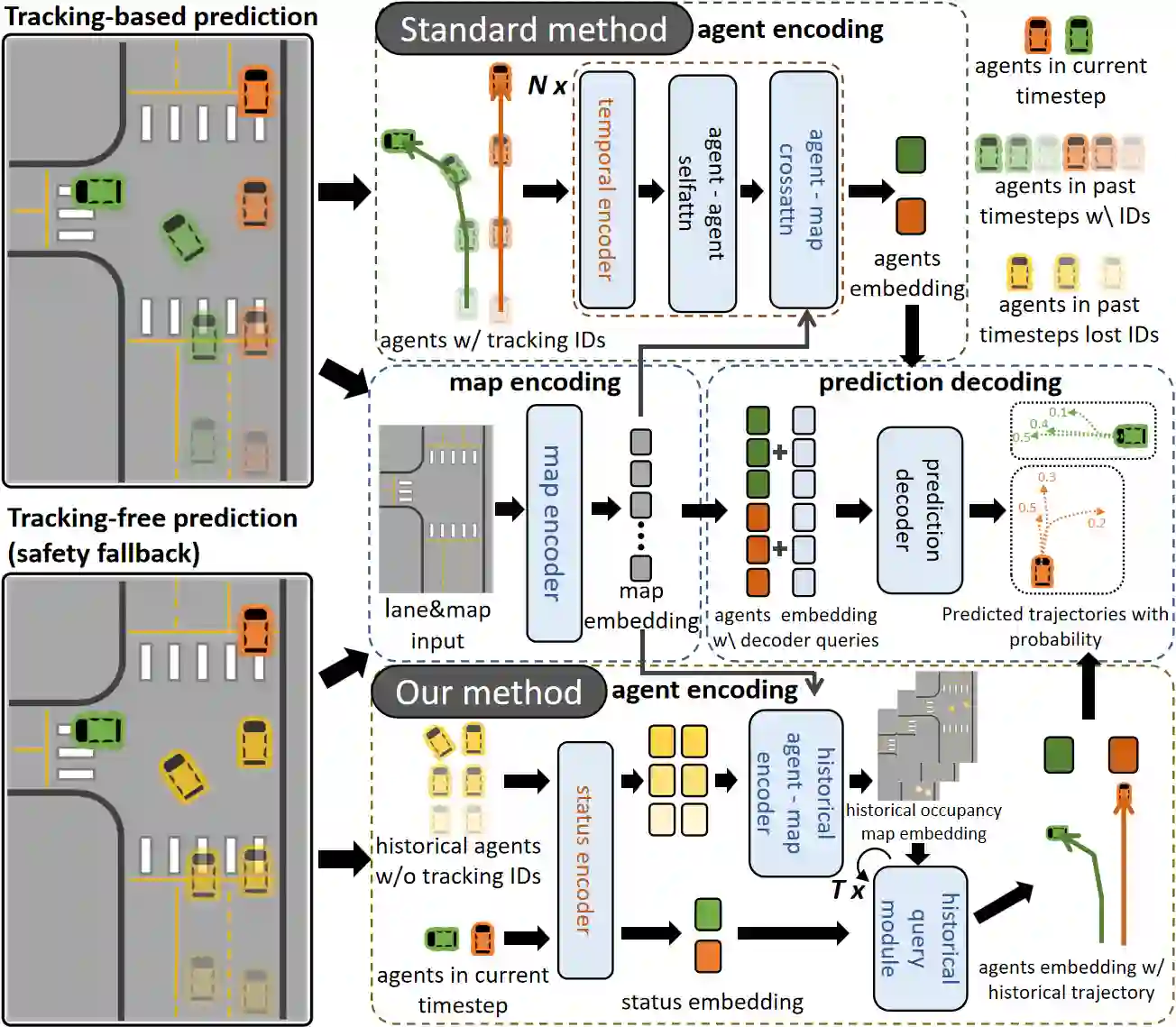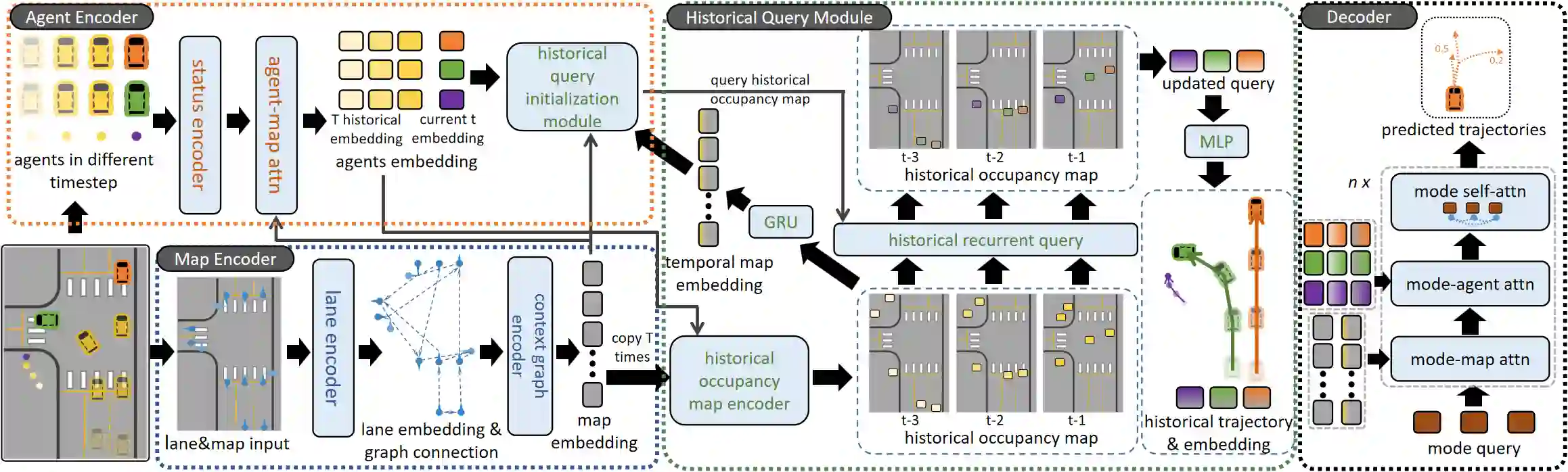 翻译:精确的运动预测对于自动驾驶至关重要,然而大多数预测器依赖于带身份关联的多目标跟踪(MOT),并假设目标被正确且连续地跟踪。当跟踪因遮挡、身份切换或漏检等原因失败时,预测质量会下降,安全风险随之增加。本文提出 \textbf{HiMAP},一种无需跟踪的轨迹预测框架,在 MOT 失效时仍能保持可靠性。HiMAP 将过去的检测结果转换为时空不变的历史占用地图,并引入一个历史查询模块,该模块以当前智能体状态为条件,从未标记的占用表示中迭代检索特定于智能体的历史信息。检索到的历史通过时序地图嵌入进行汇总,并与最终查询及地图上下文共同驱动一个 DETR 风格的解码器,以生成多模态的未来轨迹。这一设计消除了对身份标识的依赖,通过可重用的编码支持流式推理,并在跟踪不可用时作为鲁棒的回退方案。在 Argoverse~2 数据集上,HiMAP 在不使用身份标识的情况下取得了与基于跟踪的方法相当的性能,并在无跟踪设置中显著优于强基线模型,相对于微调后的 QCNet,在最终位移误差(FDE)上相对提升 11\%,平均位移误差(ADE)上提升 12\%,并降低了 4\% 的漏检率(MR)。除综合指标外,HiMAP 能够同时为所有智能体提供稳定的预测,无需等待跟踪恢复,突显了其在安全关键自动驾驶系统中的实用价值。代码发布于:https://github.com/XuYiMing83/HiMAP。