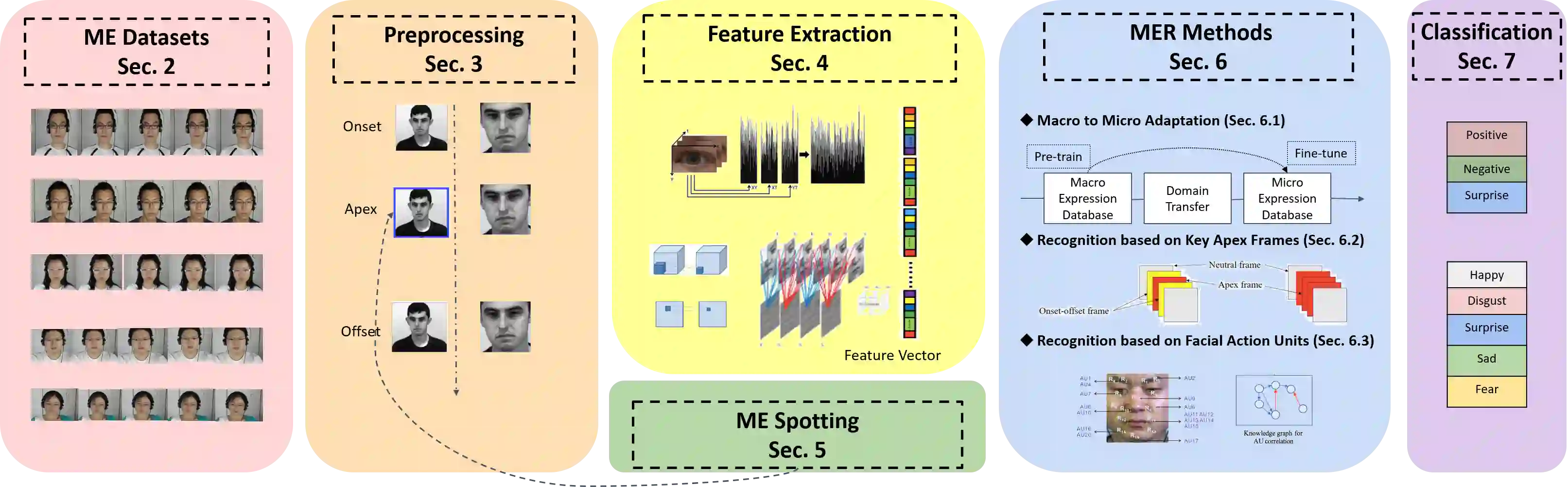 翻译:微显微表情表明情感交流期间出现短暂而微妙的面部运动。与宏观表情相比,微微表情由于时间短和细微的变化而更难分析。近年来,微表情识别引起很大注意,因为它能够有利于广泛的应用,例如警察讯问、临床诊断、抑郁症分析和商业谈判。在这次调查中,我们提供了新的概览,讨论这些天对市场汇率任务的新研究方向和挑战。例如,我们从三个新的方面审查市场汇率方法:宏观到微观的适应,基于关键的前方框架的承认,以及基于面部行动单位的承认。此外,为了减轻有限和偏差的ME数据问题,对合成数据的生成进行了调查,以丰富微表情数据的多样性。由于微表情识别可以促进微观表情分析,本文中也引入了最新定位工作。最后,我们讨论了市场汇率研究的挑战,并提出了进一步调查的可能方向。