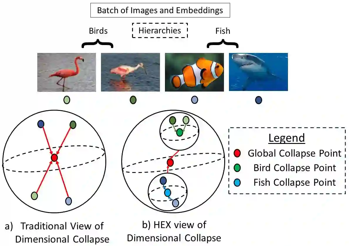 In this paper, we propose an algorithm that can be used on top of a wide variety of self-supervised (SSL) approaches to take advantage of hierarchical structures that emerge during training. SSL approaches typically work through some invariance term to ensure consistency between similar samples and a regularization term to prevent global dimensional collapse. Dimensional collapse refers to data representations spanning a lower-dimensional subspace. Recent work has demonstrated that the representation space of these algorithms gradually reflects a semantic hierarchical structure as training progresses. Data samples of the same hierarchical grouping tend to exhibit greater dimensional collapse locally compared to the dataset as a whole due to sharing features in common with each other. Ideally, SSL algorithms would take advantage of this hierarchical emergence to have an additional regularization term to account for this local dimensional collapse effect. However, the construction of existing SSL algorithms does not account for this property. To address this, we propose an adaptive algorithm that performs a weighted decomposition of the denominator of the InfoNCE loss into two terms: local hierarchical and global collapse regularization respectively. This decomposition is based on an adaptive threshold that gradually lowers to reflect the emerging hierarchical structure of the representation space throughout training. It is based on an analysis of the cosine similarity distribution of samples in a batch. We demonstrate that this hierarchical emergence exploitation (HEX) approach can be integrated across a wide variety of SSL algorithms. Empirically, we show performance improvements of up to 5.6% relative improvement over baseline SSL approaches on classification accuracy on Imagenet with 100 epochs of training.