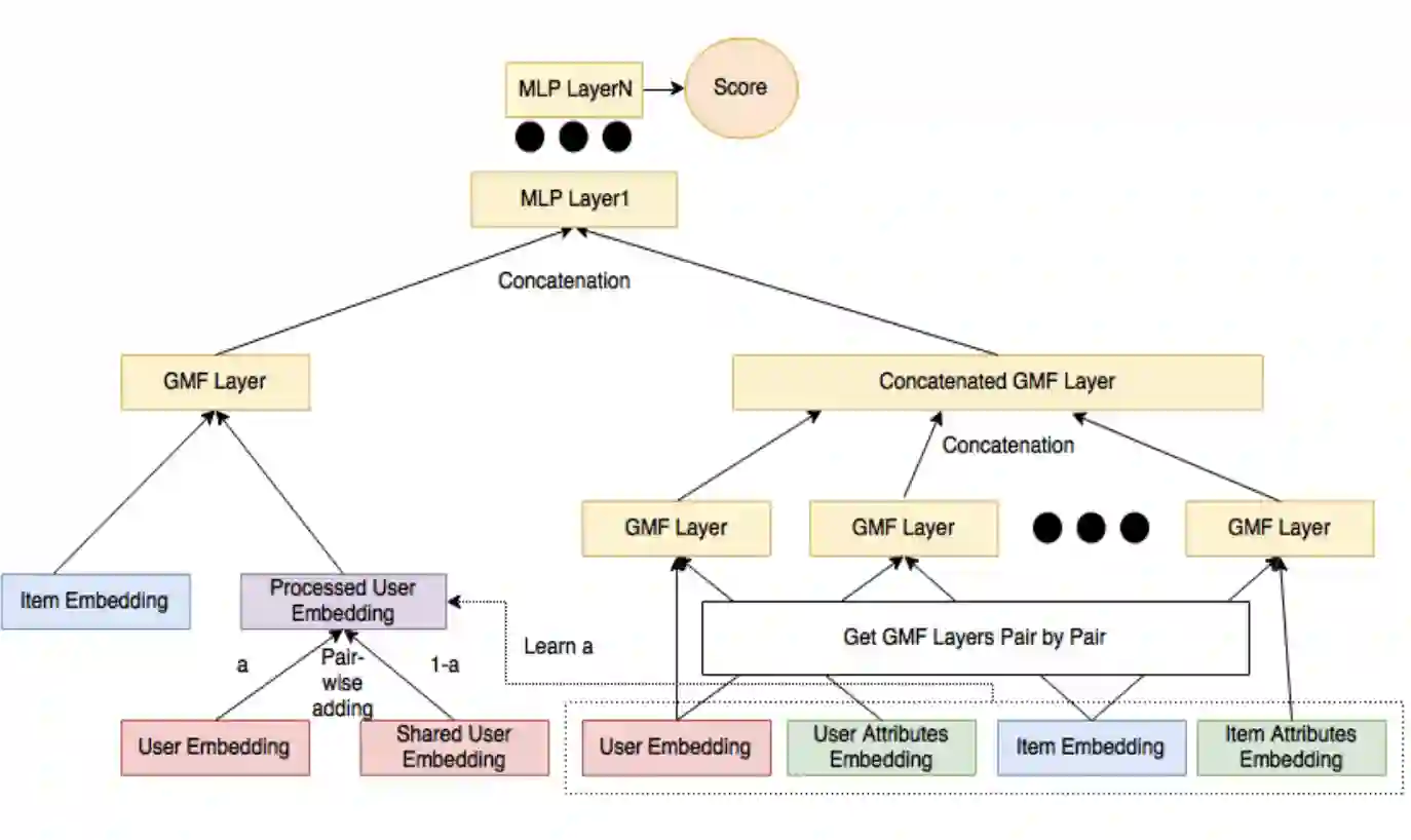 Over the past few years, deep learning has firmly established its prowess across various domains, including computer vision, speech recognition, and natural language processing. Motivated by its outstanding success, researchers have been directing their efforts towards applying deep learning techniques to recommender systems. Neural collaborative filtering (NCF) and Neural Matrix Factorization (NeuMF) refreshes the traditional inner product in matrix factorization with a neural architecture capable of learning complex and data-driven functions. While these models effectively capture user-item interactions, they overlook the specific attributes of both users and items. This can lead to robustness issues, especially for items and users that belong to the "long tail". Such challenges are commonly recognized in recommender systems as a part of the cold-start problem. A direct and intuitive approach to address this issue is by leveraging the features and attributes of the items and users themselves. In this paper, we introduce a refined NeuMF model that considers not only the interaction between users and items, but also acrossing associated attributes. Moreover, our proposed architecture features a shared user embedding, seamlessly integrating with user embeddings to imporve the robustness and effectively address the cold-start problem. Rigorous experiments on both the Movielens and Pinterest datasets demonstrate the superiority of our Cross-Attribute Matrix Factorization model, particularly in scenarios characterized by higher dataset sparsity.