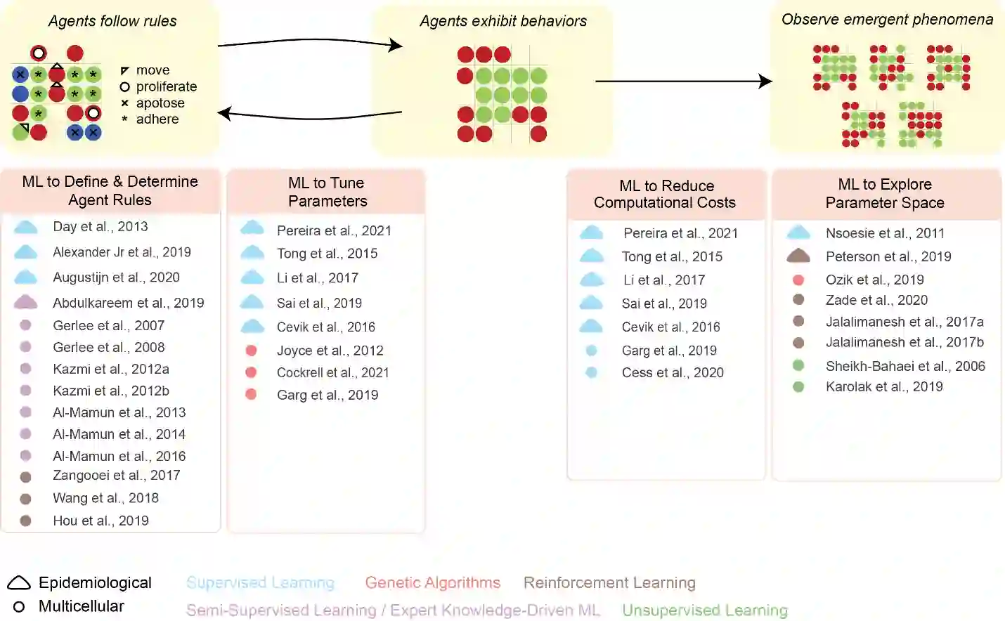 翻译:以代理为基础的模型( ABM) 是用来通过组成实体之间的相互作用模拟复杂系统的完善范例。 机器学习( ML) 指的是统计算法从自身数据中“ 精液” 取自其自身的数据, 而不强加系统行为的先验理论。 生物系统 -- -- 从分子、 细胞到整个生物体 -- -- 由大量实体组成, 由复杂的互动网络管理, 由跨越许多空间尺度的复杂互动网络管理, 显示实体之间的非直线性、 随机性和错综复杂的组合。 这种系统的宏观特性和集体动态很难通过连续建模和平均格式来捕捉取。 ABML采取“ 自下而上而上”的方法, 避免这些困难, 使一个人能够轻松地提议和测试一套定义明确的“规则 ”, 从分子到整个系统中的单个实体( 代理人), 评估一个系统, 传播其状态, 通过离散的时间步, 有效地模拟这个系统, 允许观测结果, 和系统特性分析。 由于管理反弹道导弹的规则可能从抽象系统到实验性系统,, 从实验性地, 变现一个系统,, 货币变货币变货币规则 。