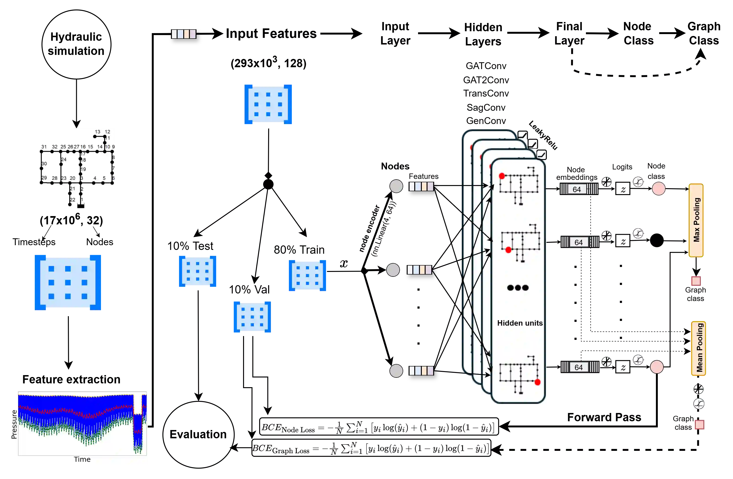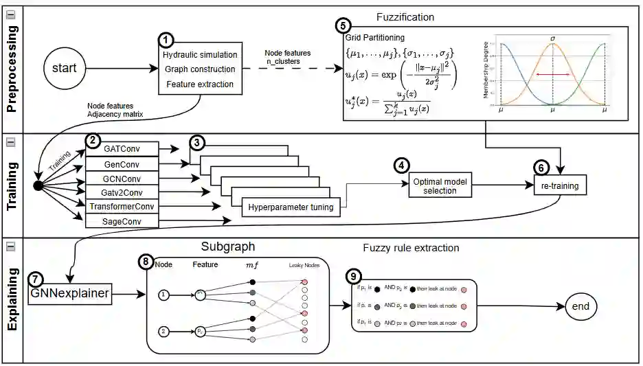 翻译:及时检测供水管网泄漏对于节约资源和维持运行效率至关重要。尽管图神经网络(GNNs)在捕捉传感器数据时空依赖性方面表现出色,但其黑箱特性以及针对供水网络的图结构可解释模型研究有限,阻碍了实际应用。我们提出了一种可解释的GNN框架,该框架集成互信息以识别关键网络区域,并利用模糊逻辑为节点分类任务提供清晰的、基于规则的解释。在对多种GNN架构进行基准测试后,我们选择了性能优异的广义图卷积网络(GENConv),并开发了一种模糊增强变体,可为分类的泄漏位置提供直观解释。我们的模糊图神经网络(FGENConv)在图F1分数上分别达到检测0.889和定位0.814,略低于标准GENConv的0.938和0.858,但其通过提供空间局部化的、基于模糊规则的解释进行补偿。通过在精度与可解释性之间取得适当平衡,所提出的模糊网络能够帮助水力工程师验证预测的泄漏位置、节约人力资源并优化维护策略。代码可在github.com/pasqualedem/GNNLeakDetection获取。