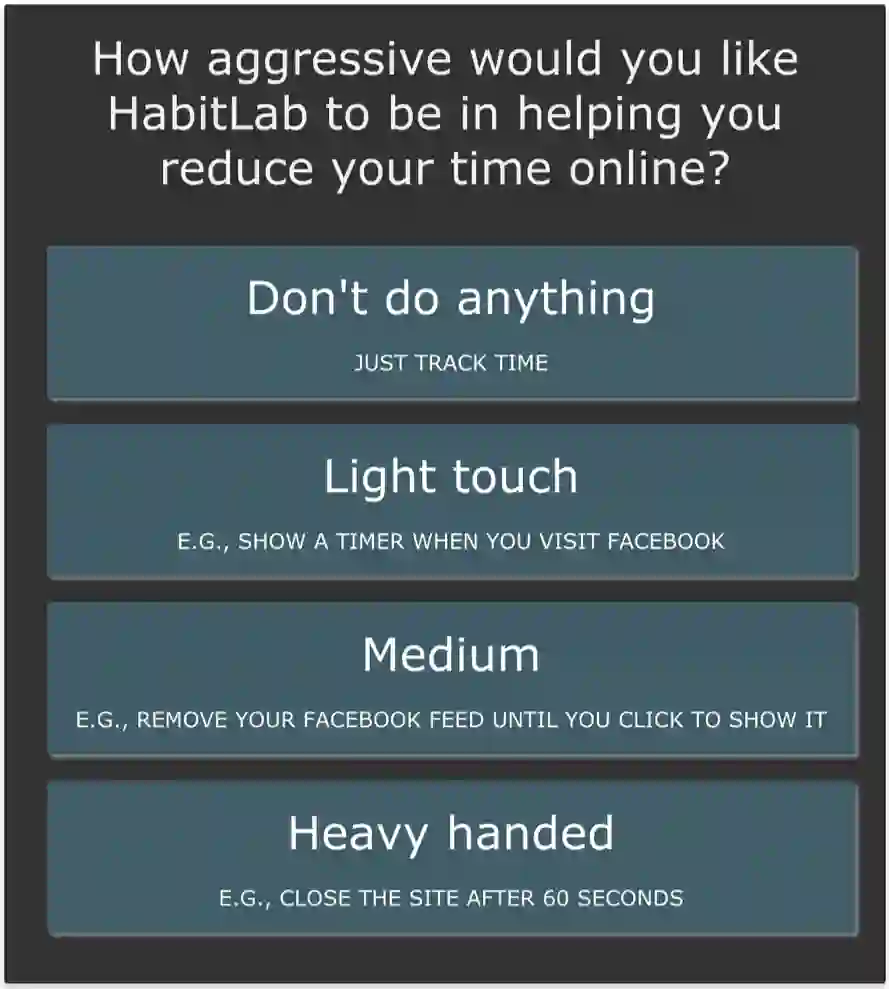翻译:我们如何有效地坚持有助于我们控制在线浏览习惯的试探和干预?如果我们暂时失效并禁用行为改变系统,我们是否以后恢复遵守,或者水坝破裂?在本文中,我们通过对Habitlab上8000+用户的日志分析来调查这些问题,HabitLab上的行为改变平台帮助用户缩短在线时间。我们发现,虽然用户通常从挑战性强的干预开始,但随着时间的流逝,他们还是可以滑入更容易和更容易的干预中。尽管如此,许多人仍然期望很快回到更困难的干预中来:他们一再选择在下次访问时再次被要求改变困难,拒绝让系统避免他们选择简单干预。