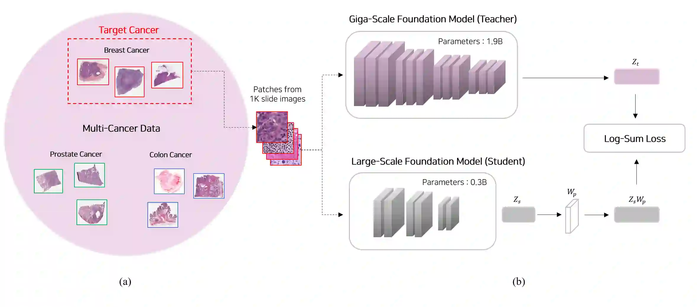 翻译:近期病理学基础模型的研究表明,扩大训练数据规模、增加癌症类型多样性以及提升模型参数量均能持续改善模型性能。然而,千亿级基础模型(在覆盖数十种癌症类型的数十万张病理切片上训练,包含数百亿参数)因其在开发与部署阶段产生的巨大计算成本,在实际应用中面临显著挑战。本研究提出一种名为G2L框架的创新策略,旨在将仅包含千亿级模型参数量$15\%$的大规模基础模型,在癌症特异性任务中的性能提升至与千亿级模型相当的水平。该方法通过知识蒸馏技术,仅使用目标癌症(如乳腺癌、前列腺癌等)的1K张病理切片,将千亿级模型的能力迁移至大规模模型。所得蒸馏模型不仅在同规模(即大规模)模型的多个基准测试中超越了现有最优模型,更值得注意的是,在部分基准测试中甚至超越了千亿级教师模型及超大规模模型。此外,该蒸馏模型展现出更高的鲁棒性指数,表明其对来自多机构的图像变异具有更强的适应能力。这些发现证明,所提出的大规模模型蒸馏方法是一种数据与参数高效的技术路径,可在不产生过高计算负担的前提下,为癌症特异性应用实现千亿级模型的性能水平。