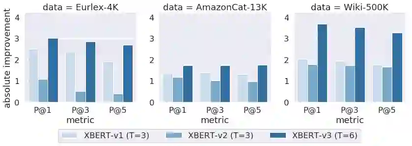翻译:极端多标签文本分类 (XMC) 旨在将每个输入文本标记为来自极大标签组的最相关标签,例如产品分类和电子商务建议中出现的标签。最近,诸如BERT等预先培训的语言代表模型在一系列广泛的NLP任务中取得了显著的最新性能,包括小标签组(通常少于千人)的判刑分类。事实上,在应用BERT到 XMC 问题上存在若干挑战。主要的挑战有:(一) 很难从一个极大标签组中获取最相关的标签的可靠性和相关性,例如产品分类和电子商务建议。最近,BERT等预先培训的语言代表模型的大小可能非常大和范围。为了克服这些挑战,我们提出了X-BERT模型的首次可能的微调模型,用于对 XMC 问题进行扩缩的解决方案。具体地,X-BERT 将标签和文档文本的改进用于构建标签的升级,这会使标签群集的改进达到更精确的等级,以便更精确的标签组别具有更精确的可靠性。在模型上, 5-BER 数据库的内,最后的内, 正在将一个较精确的顺序关系中,而BERBILILIL 。