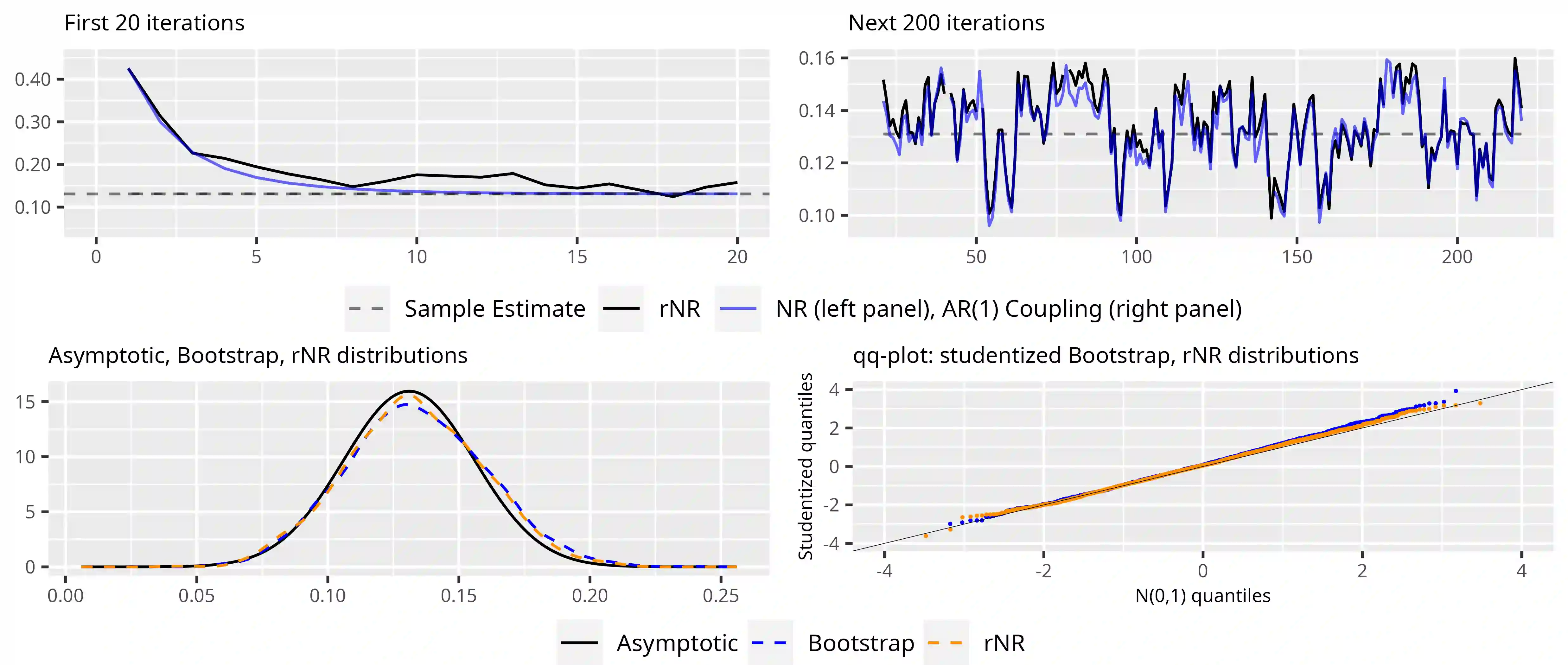 翻译:在非线性估算中, 通常会通过靴子陷阱推断来评估抽样不确定性。 对于复杂的模型, 它可以进行大量计算。 本文将优化与重新取样相结合: 将随机优化转化为快速再采样设备。 引入了两种方法: 重新标注牛顿- 拉夫森( rNR) 和重新标定准牛顿( rqN) 算法。 两种方法都产生可以用来计算一致的估算、 信任间隔和标准差错的图画。 抽取由梯度和海珊( 或近似) 生成, 由在每次迭代中重新采样的批数据计算出来。 在目标平滑和严格交织时, 拟议的方法会迅速从优化过渡到再采样。 模拟和实验应用可以说明大尺度方法的属性和计算密集问题。 与常客和巴伊斯方法的比较会突出算法的特征 。