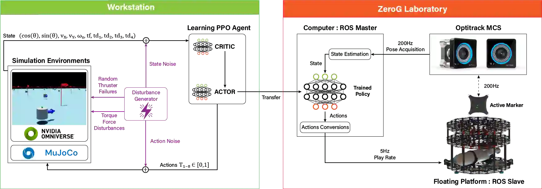 This investigation introduces a novel deep reinforcement learning-based suite to control floating platforms in both simulated and real-world environments. Floating platforms serve as versatile test-beds to emulate microgravity environments on Earth. Our approach addresses the system and environmental uncertainties in controlling such platforms by training policies capable of precise maneuvers amid dynamic and unpredictable conditions. Leveraging state-of-the-art deep reinforcement learning techniques, our suite achieves robustness, adaptability, and good transferability from simulation to reality. Our Deep Reinforcement Learning (DRL) framework provides advantages such as fast training times, large-scale testing capabilities, rich visualization options, and ROS bindings for integration with real-world robotic systems. Beyond policy development, our suite provides a comprehensive platform for researchers, offering open-access at https://github.com/elharirymatteo/RANS/tree/ICRA24.