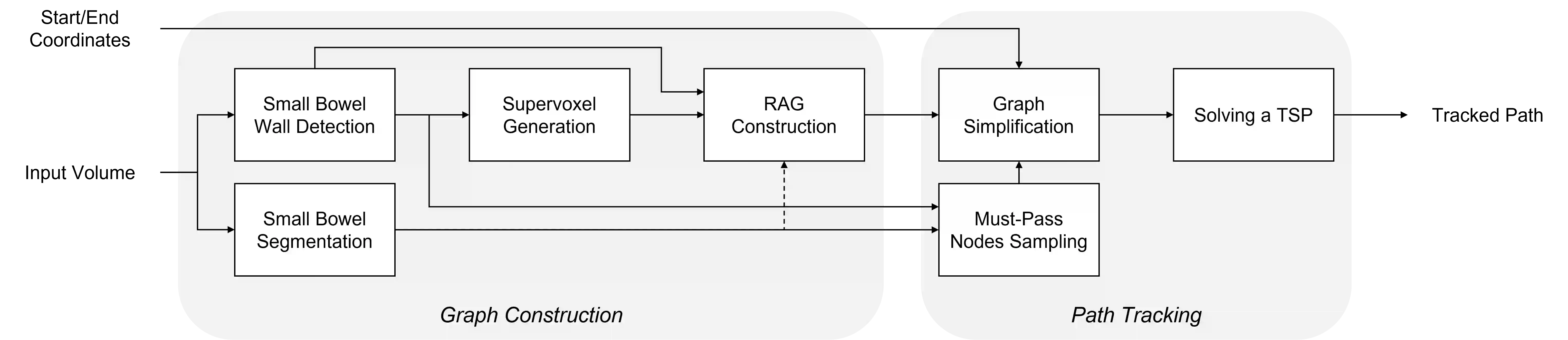 翻译:我们提出了一个用于小肠道跟踪的新型图形理论方法。 它的写法是在基于肠道墙探测的图表上找到给定起始点和终点节点之间的最低成本路径。 我们观察到,即使用墙的探测,跟踪路径在小肠道不同部分接触处穿透了模糊的墙壁,也很容易找到许多短切点的微小的解决方案。 因此, 我们提议在寻找小肠道以更好地覆盖整个小肠道的路径时,纳入必须通过点节点。 拟议的方法并不要求用地面真相路径进行培训,而采用以前的方法。 我们获得了地面真相路径,这些路径从小肠道开始一直连接到小肠道结束,用于10个腹部CT扫描,从而能够评估小肠道整个行道的路径跟踪。 拟议的方法显示,与基线方法相比,若干计量方法有明显改进。 所追踪的路径的最大长度,按照拟议的方法,没有误差,平均超过800毫米。