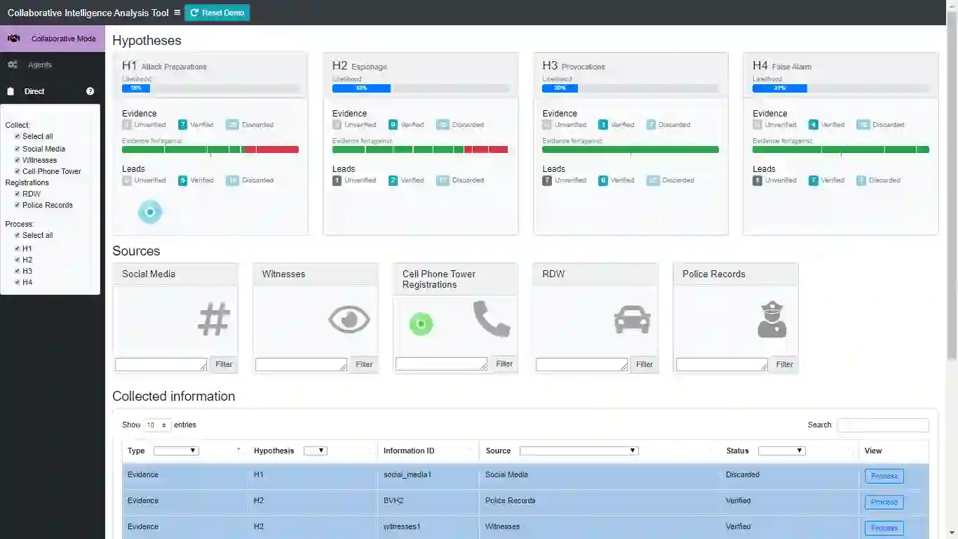 Despite the intricacies involved in designing a computer as a teampartner, we can observe patterns in team behavior which allow us to describe at a general level how AI systems are to collaborate with humans. Whereas most work on human-machine teaming has focused on physical agents (e.g. robotic systems), our aim is to study how humans can collaborate with information agents. We propose some appropriate team design patterns, and test them using our Collaborative Intelligence Analysis (CIA) tool.