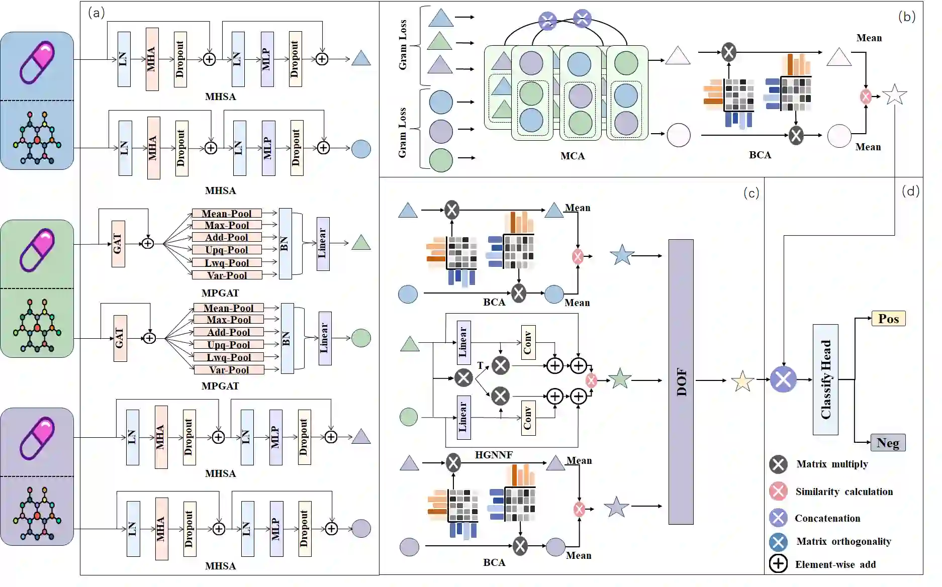 翻译:药物-靶点相互作用(DTI)的准确预测在药物发现中至关重要。然而,现有方法往往难以捕捉深层的模态内特征交互或实现有效的跨模态对齐,从而限制了预测性能与泛化能力。为应对这些挑战,我们提出了M3ST-DTI,一种多任务学习模型,能够实现多模态特征的多阶段整合与对齐以进行DTI预测。M3ST-DTI整合了三种类型的特征——文本特征、结构特征与功能特征,并利用自注意力机制与混合池化图注意力模块增强了模态内表征。为实现早期特征对齐与融合,该模型将MCA与Gram损失作为结构约束进行整合。在后期阶段,BCA模块捕捉各模态内药物与靶点间的细粒度交互,而深度正交融合模块则减轻了特征冗余。在基准数据集上的广泛评估表明,M3ST-DTI在多种评价指标上均持续优于现有最先进方法。