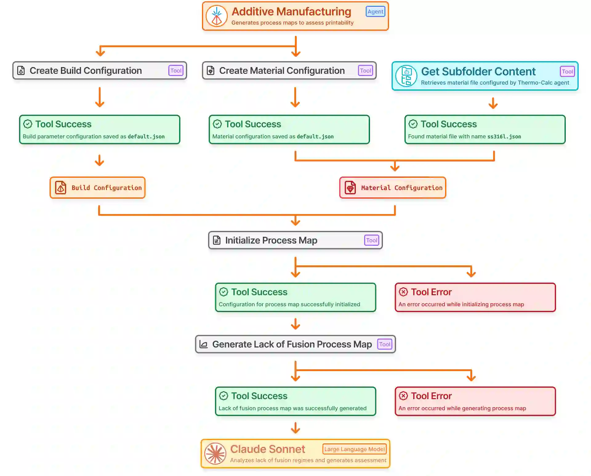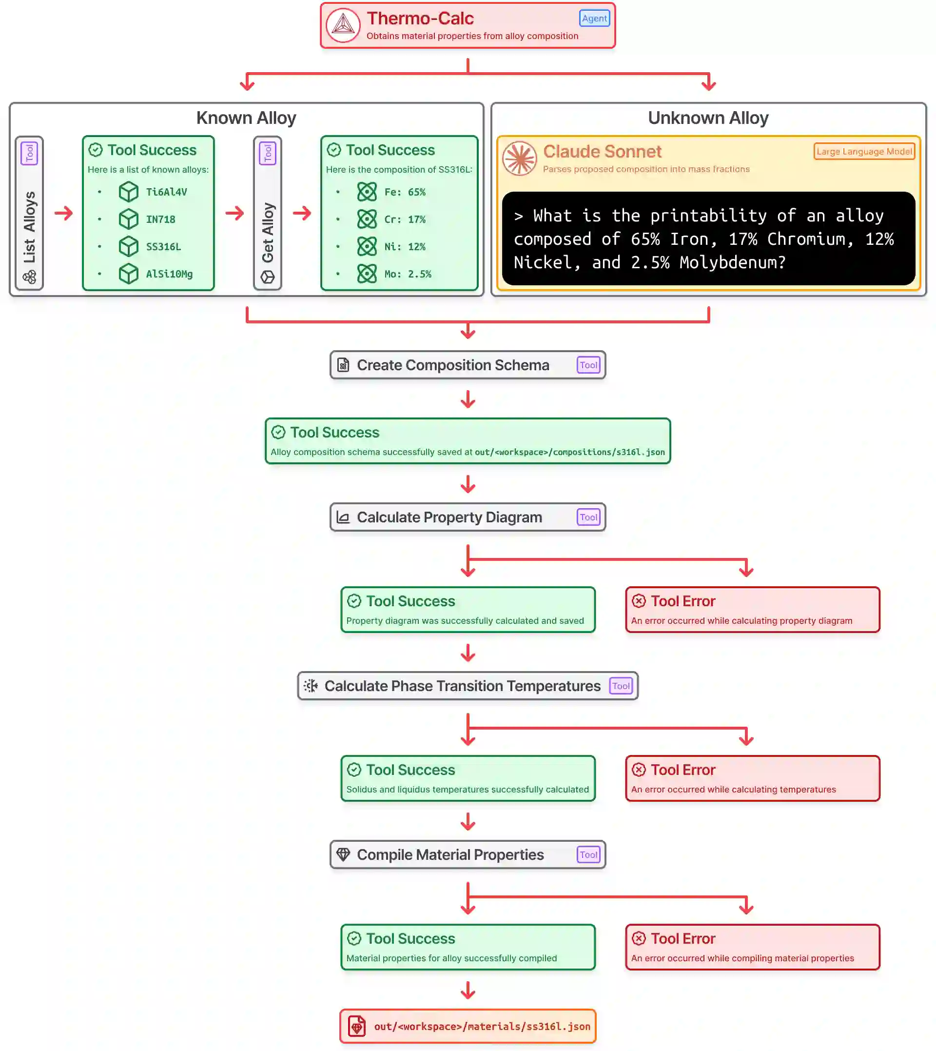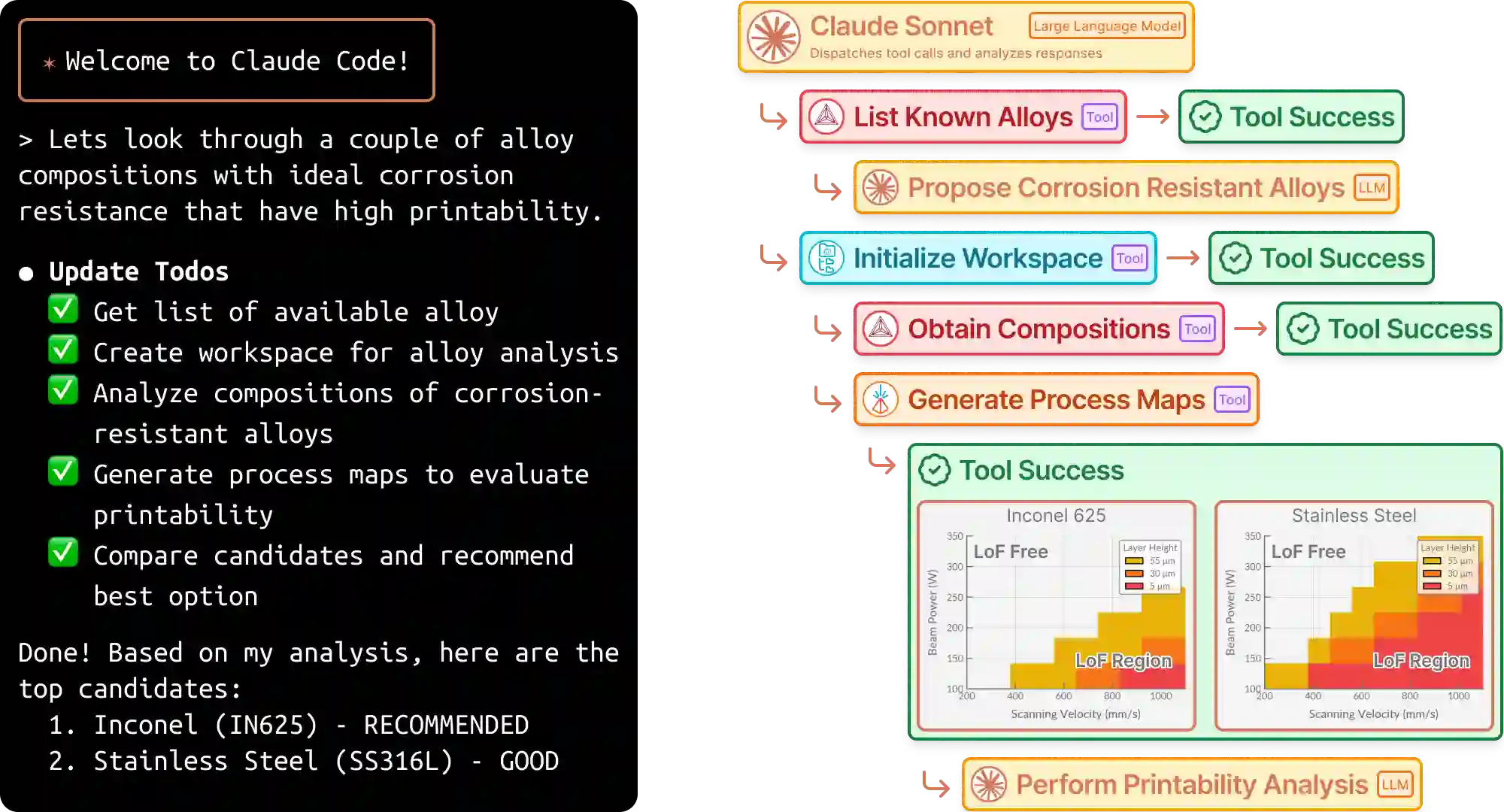 翻译:智能体系统能够智能运用研究工具,增强研究人员探索现有问题并提出创新解决方案的能力。在增材制造领域,合金选择与评估始终是一项复杂挑战,通常需要跨材料科学、热力学模拟及实验分析等多领域的专业知识。基于大语言模型的智能体可通过调用其广泛知识库,利用模型上下文协议调度工具调用,以执行热物理性质相图计算、未熔合工艺窗口图生成等操作,从而有效推进该研究进程。此外,多智能体系统能够对复杂的用户指令进行逻辑推演,针对SS316L、IN718等常见合金的未熔合工艺窗口提供分析报告,并提出已知合金的成分变体方案。这些智能体可根据工具调用结果动态调整任务执行路径,从而在实际环境中实现自主决策。本研究旨在展示采用大语言模型驱动的多智能体系统,在自动化与加速新型及已知增材制造合金评估任务方面的显著优势。