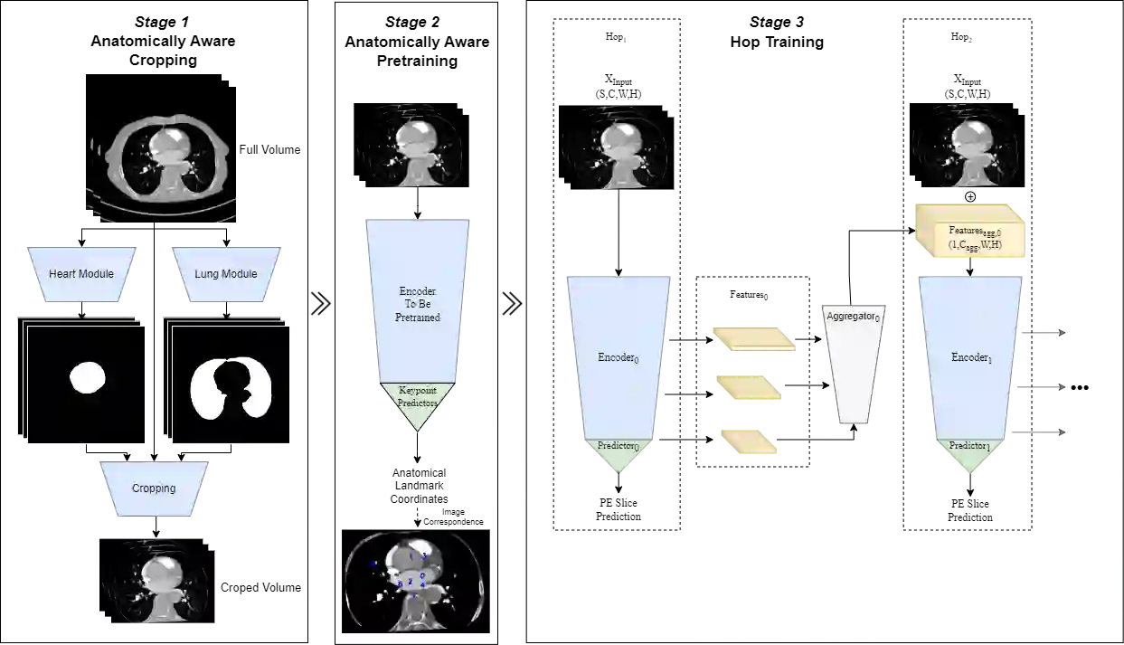 Pulmonary Embolisms (PE) represent a leading cause of cardiovascular death. While medical imaging, through computed tomographic pulmonary angiography (CTPA), represents the gold standard for PE diagnosis, it is still susceptible to misdiagnosis or significant diagnosis delays, which may be fatal for critical cases. Despite the recently demonstrated power of deep learning to bring a significant boost in performance in a wide range of medical imaging tasks, there are still very few published researches on automatic pulmonary embolism detection. Herein we introduce a deep learning based approach, which efficiently combines computer vision and deep neural networks for pulmonary embolism detection in CTPA. Our method features novel improvements along three orthogonal axes: 1) automatic detection of anatomical structures; 2) anatomical aware pretraining, and 3) a dual-hop deep neural net for PE detection. We obtain state-of-the-art results on the publicly available multicenter large-scale RSNA dataset.