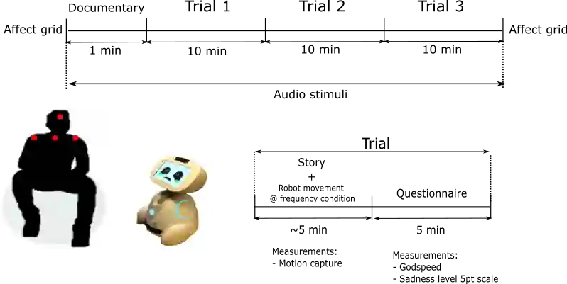翻译:在未来十年里,社会机器人将在许多公共空间实施,为人类提供服务。我们质疑这些社会机器人的特性,以获得接受和自发的情感互动。更具体地说,在本研究中,我们报告机器人在面对面的互动任务中,在与一名人类参与者面对面的互动任务中,无意识运动频率对情感传染的影响。机器人系统Buddy编程采取悲伤的姿态和面部表情,同时讲述三个悲哀故事,在低、中、高频率上下移动。每个参与者(总共N=15)都应邀坐在Buddy面前,倾听故事。在3D运动捕捉系统中记录了人类参与者态势的不觉变化(Quasulization)。结果显示,在低频率试验和高频率试验中,肩/肩/肩对地面的倾向更加强烈。当Buddy移动速度缓慢时,自发运动的数量也会增加。当两个个人参与社会互动时,这些结果会在实验心理学中回响。在上帝速度问卷中获得的分数进一步表明,当朋友运动动作动作缓慢时,可能会发生情感传染,因为机器人运动的频率系统具有更连续的频率和机变速度。