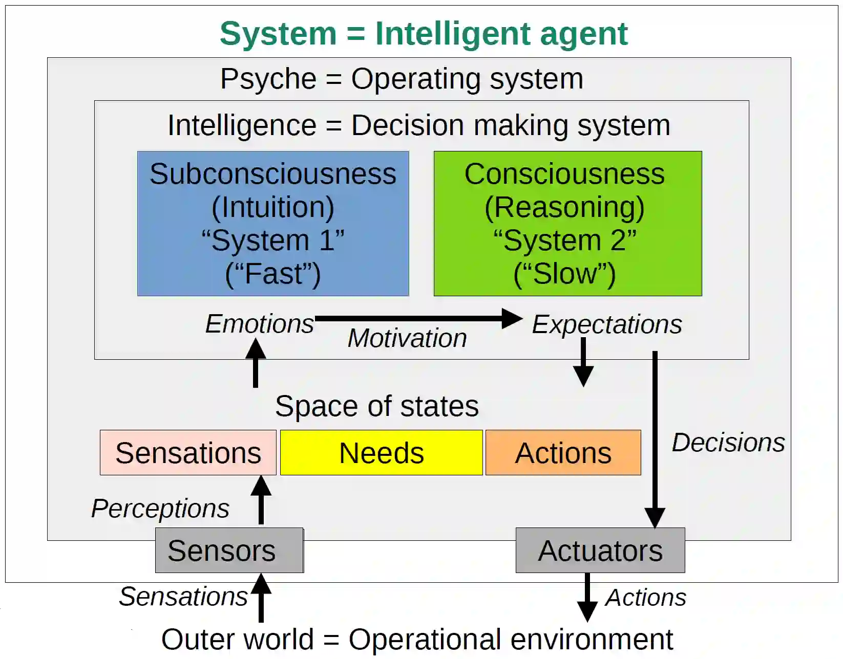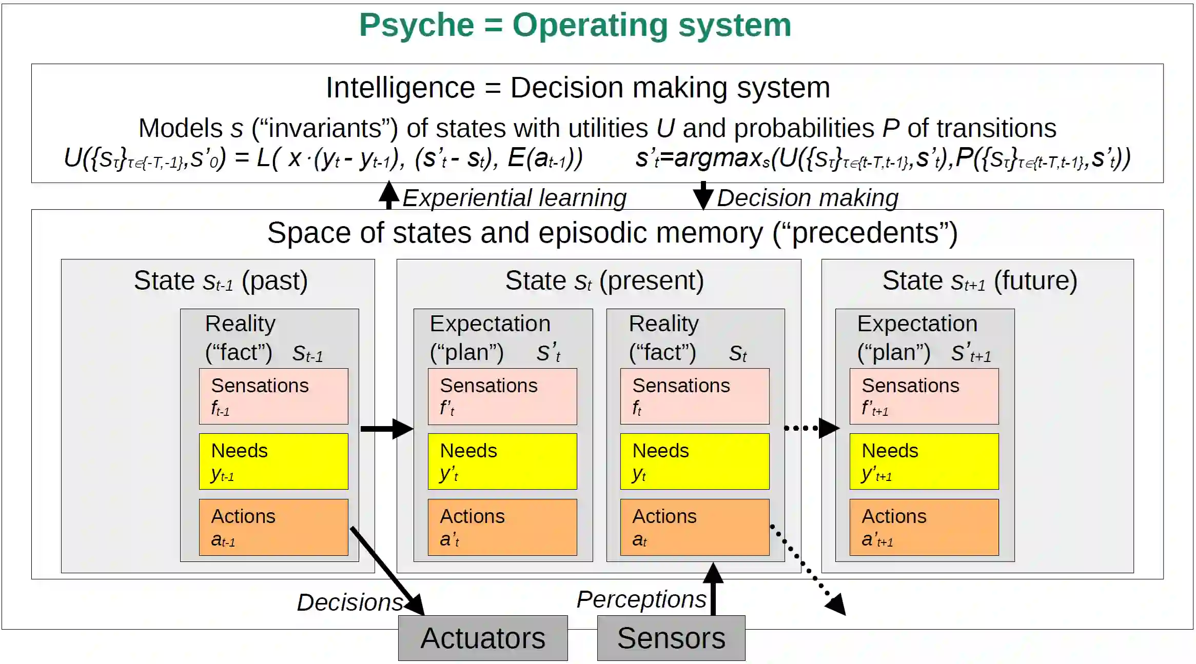 翻译:本文综述了在构建人工心灵背景下对人类心理建模的方法。基于此综述,本文提出了一种认知架构的概念,其中心灵被视为生命体或人工主体的操作系统,包含一个状态空间——包括决定主体存在意义的需求状态(这些需求与外部世界刺激相关),以及作为在此世界中采取行动以满足这些需求的决策系统的智能。基于这一概念,本文提出了一种计算形式化方法,用于通过包含主体需求的状态空间中的经验学习来创建智能体的人工通用智能系统,同时考虑这些需求对智能体的生物学或存在意义,以及主体的感知和行动。因此,构建人工通用智能的问题被形式化为:在特定智能体需求空间中进行最优决策的系统,该系统需在不确定性条件下最大化目标达成成功率、最小化存在性风险并最大化能量效率。本文还展示了该模型的最小实验实现。