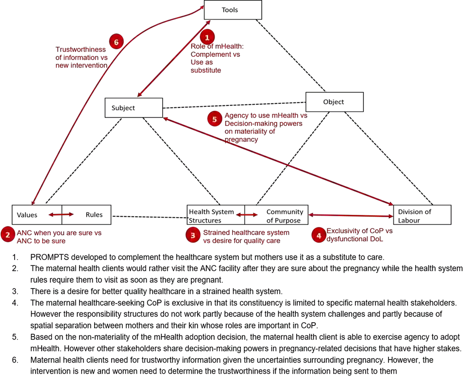 翻译:本文的目的是与信息系统的使用环境进行互动,以此解释细微的人类技术互动。本文特别建议将寻求保健的概念化作为一种活动,为技术利用提供更丰富的解释。这是根据活动理论进行的一项解释性研究,目的是将寻求保健的概念化为最起码的用途。AT的核心方面框架用于分析肯尼亚环境中的一个经验性健康案例,从而说明AT如何应用于研究技术应用。本文通过解释在复杂的人类技术互动背景下可能出现的各种利用行为来说明技术的使用;从复杂的采用过程到确定在干预中继续信任与信息信任和潜在的技术应对战略的机制,该文件是使AT能够应用来研究技术使用的新尝试。因此,它提供了更广泛的用途,同时为将寻求保健概念化作为一种活动而可能实现的设计和实施提供了见解。这种洞见可能有助于设计以病人为中心的系统。