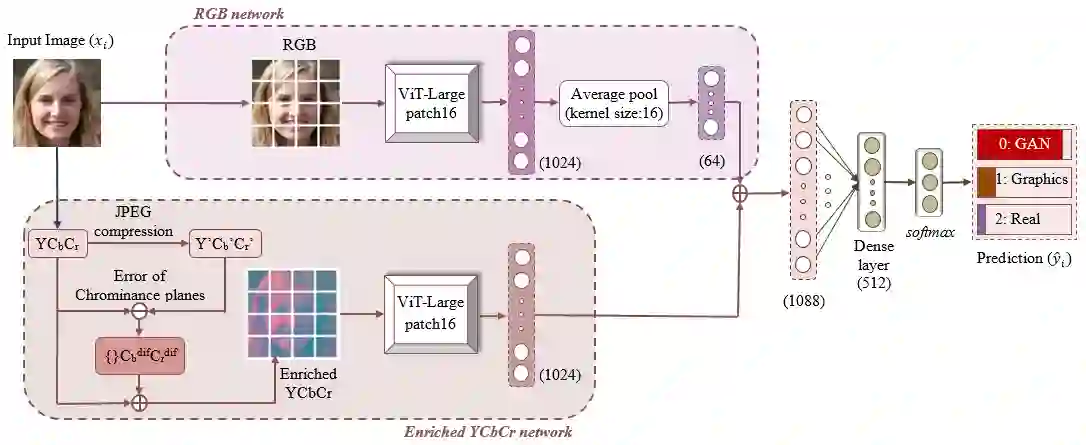 The works in literature classifying natural and computer generated images are mostly designed as binary tasks either considering natural images versus computer graphics images only or natural images versus GAN generated images only, but not natural images versus both classes of the generated images. Also, even though this forensic classification task of distinguishing natural and computer generated images gets the support of the new convolutional neural networks and transformer based architectures that can give remarkable classification accuracies, they are seen to fail over the images that have undergone some post-processing operations usually performed to deceive the forensic algorithms, such as JPEG compression, gaussian noise, etc. This work proposes a robust approach towards distinguishing natural and computer generated images including both, computer graphics and GAN generated images using a fusion of two vision transformers where each of the transformer networks operates in different color spaces, one in RGB and the other in YCbCr color space. The proposed approach achieves high performance gain when compared to a set of baselines, and also achieves higher robustness and generalizability than the baselines. The features of the proposed model when visualized are seen to obtain higher separability for the classes than the input image features and the baseline features. This work also studies the attention map visualizations of the networks of the fused model and observes that the proposed methodology can capture more image information relevant to the forensic task of classifying natural and generated images.