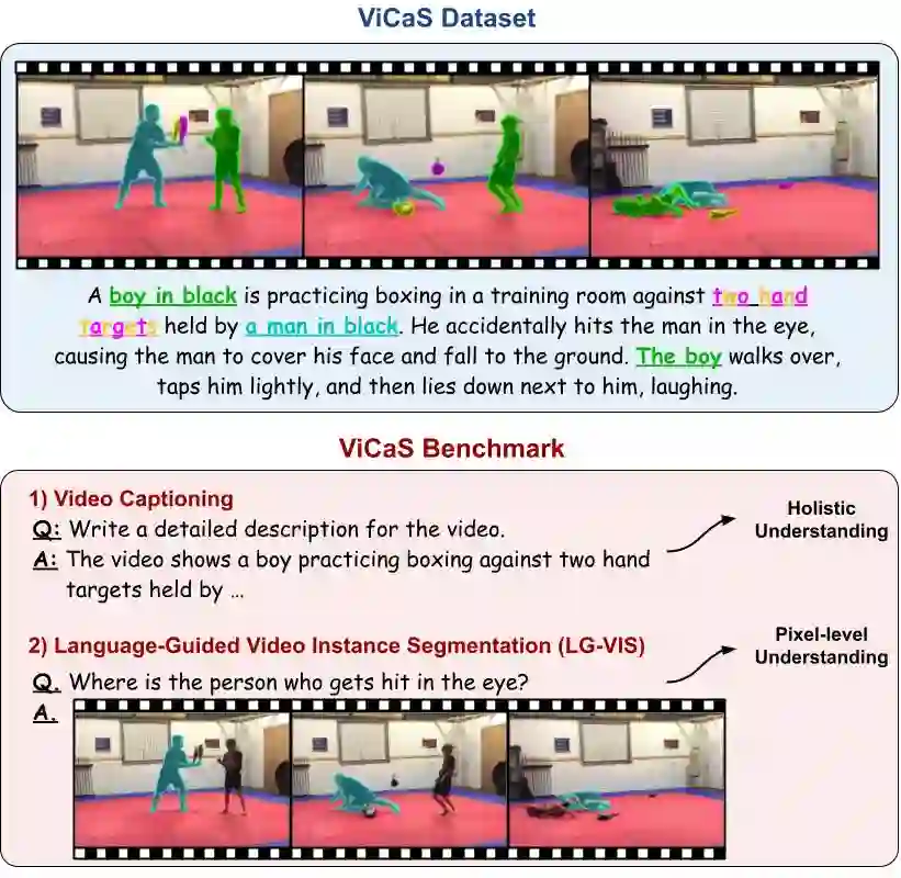 Recent advances in multimodal large language models (MLLMs) have expanded research in video understanding, primarily focusing on high-level tasks such as video captioning and question-answering. Meanwhile, a smaller body of work addresses dense, pixel-precise segmentation tasks, which typically involve category-guided or referral-based object segmentation. Although both directions are essential for developing models with human-level video comprehension, they have largely evolved separately, with distinct benchmarks and architectures. This paper aims to unify these efforts by introducing ViCaS, a new dataset containing thousands of challenging videos, each annotated with detailed, human-written captions and temporally consistent, pixel-accurate masks for multiple objects with phrase grounding. Our benchmark evaluates models on both holistic/high-level understanding and language-guided, pixel-precise segmentation. We also present carefully validated evaluation measures and propose an effective model architecture that can tackle our benchmark. Project page: https://ali2500.github.io/vicas-project/