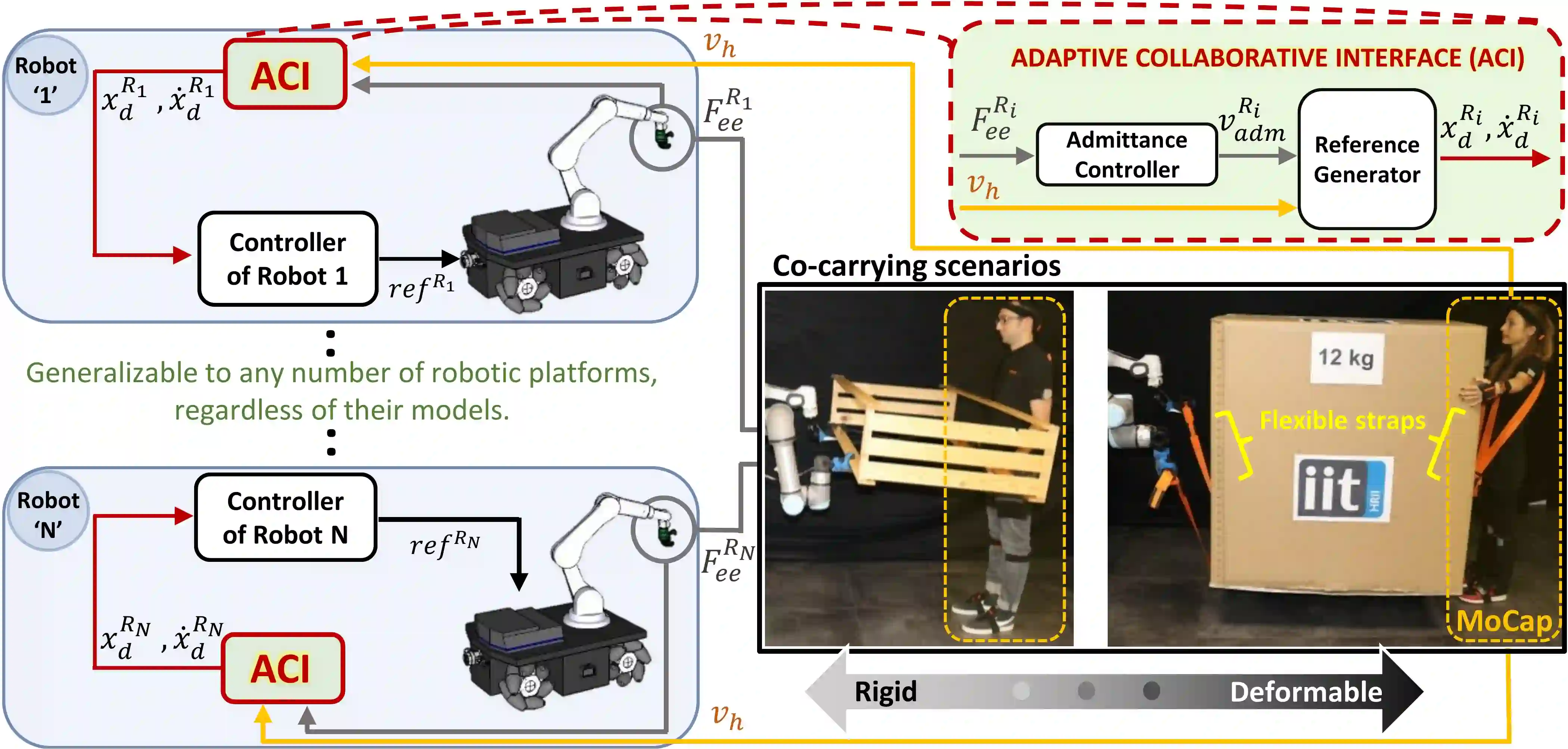 This manuscript introduces an object deformability-agnostic framework for co-carrying tasks that are shared between a person and multiple robots. Our approach allows the full control of the co-carrying trajectories by the person while sharing the load with multiple robots depending on the size and the weight of the object. This is achieved by merging the haptic information transferred through the object and the human motion information obtained from a motion capture system. One important advantage of the framework is that no strict internal communication is required between the robots, regardless of the object size and deformation characteristics. We validate the framework with two challenging real-world scenarios: co-transportation of a wooden rigid closet and a bulky box on top of forklift moving straps, with the latter characterizing deformable objects. In order to evaluate the generalizability of the proposed framework, a heterogenous team of two mobile manipulators that consist of an Omni-directional mobile base and a collaborative robotic arm with different DoFs is chosen for the experiments. The qualitative comparison between our controller and the baseline controller (i.e., an admittance controller) during these experiments demonstrated the effectiveness of the proposed framework especially when co-carrying deformable objects. Furthermore, we believe that the performance of our framework during the experiment with the lifting straps offers a promising solution for the co-transportation of bulky and ungraspable objects.