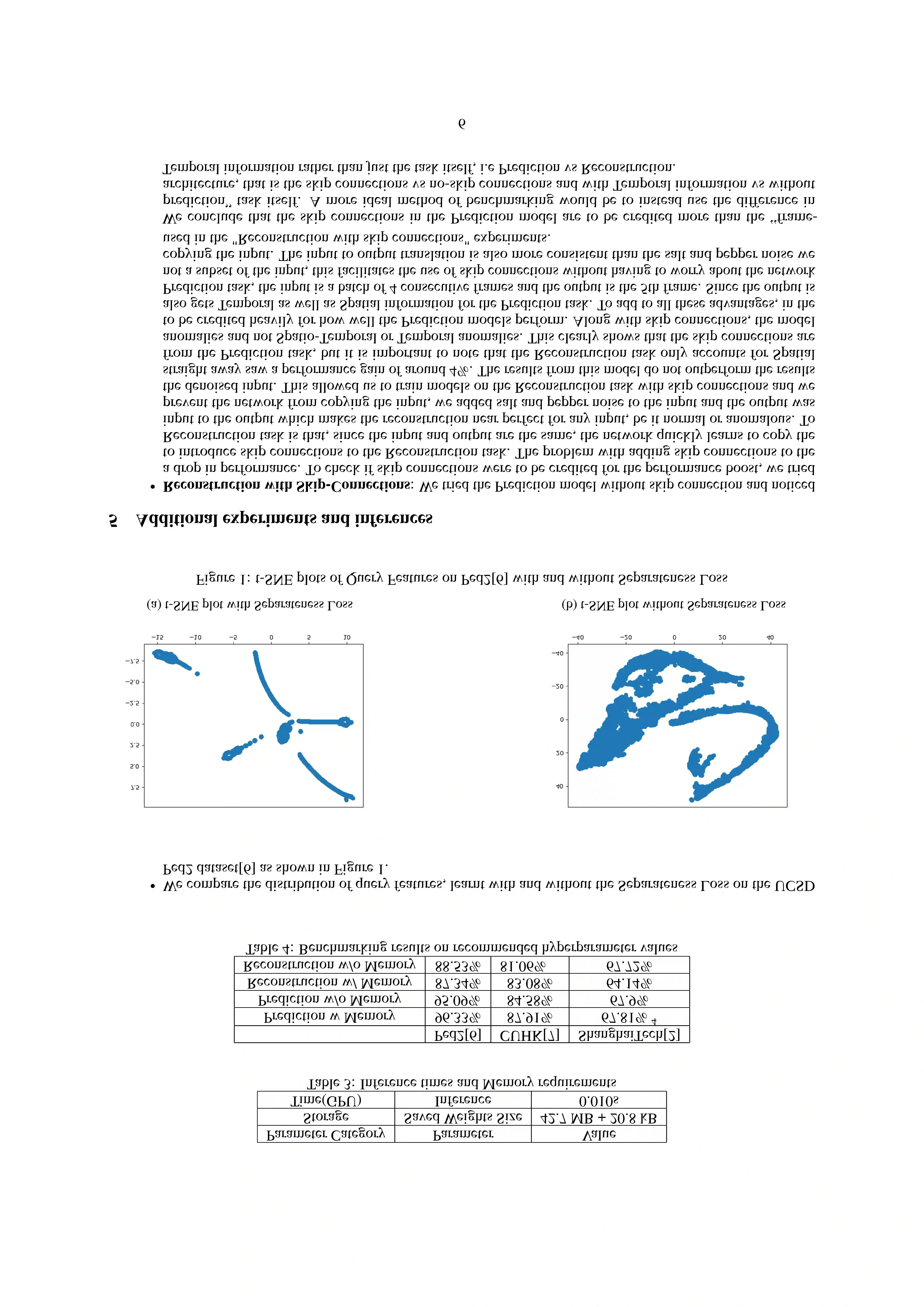 翻译:作者们在论文中采用了一种未受监督的异常现象检测新方法,在他们的文章中使用了一个新引入的记忆模块。我们验证了作者们的主张,即通过帮助网络学习原型模式,这有助于改善工作表现,并利用所学的记忆来降低进化神经网络的代表性能力。此外,我们验证了作者们提出的两个损失的有效性,即单独损失和压缩损失,目的是增加记忆项目和深层学习特征的歧视性力量。我们借助t-SNE的记忆项目图块来测试效果。