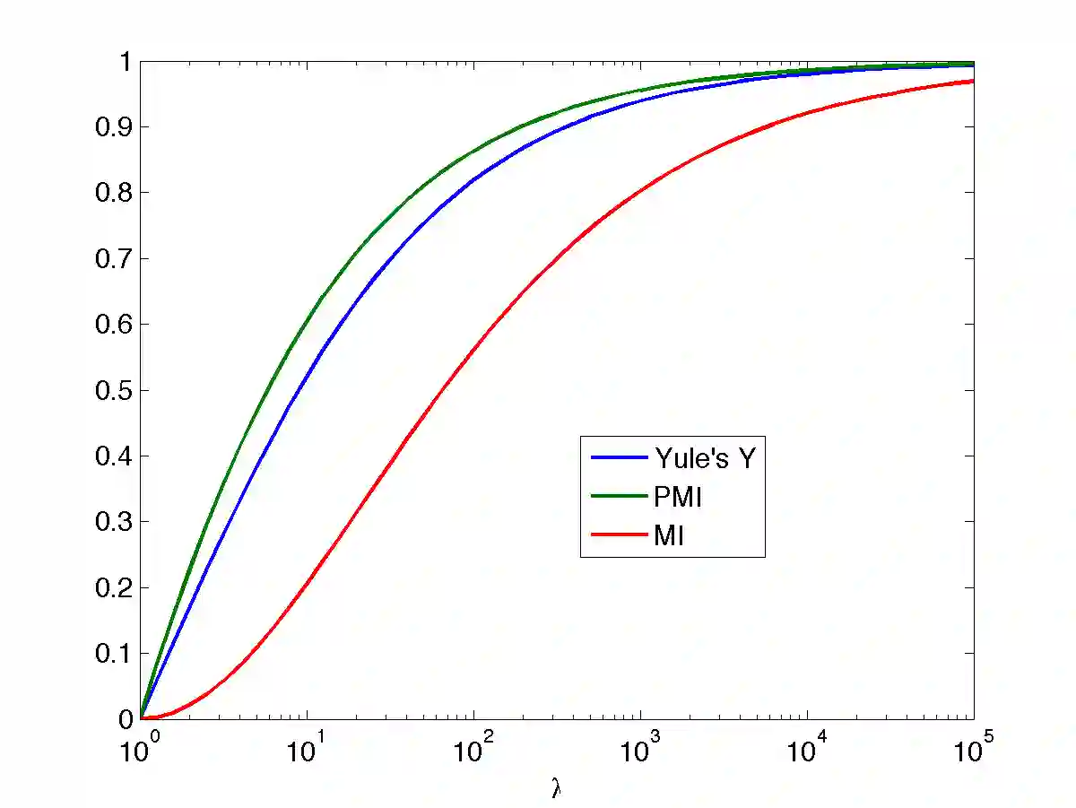 翻译:巴洛(1985年)假设,如果美元P(A,B)\gg P(A)\(B)\美元P(B),两起事件的共同发生是“可疑”的。我们首先审查传统的关联度2倍于2美元的应急表,包括Yule的Y$(Yule,1912年),这仅取决于几率比率$\lambda$(Ule,1912年),并且独立于该表的边缘概率。然后我们讨论相互信息(MI)和点对点的相互信息(PMI),这取决于美元P(A,B)/P(P)P(B)的比例,作为联系措施。我们表明,一旦边缘效应消除,MI和PMI的功能接近于$Y,相当于$@lambda$(Y)的功能。一些研究社区广泛使用了点对等信息来标出可疑的巧合,但重要的是要牢记PMI对边缘的敏感度,而稀疏漏事件的分数增加。