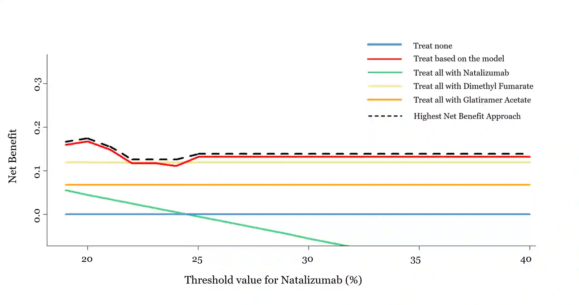 Decision curve analysis can be used to determine whether a personalized model for treatment benefit would lead to better clinical decisions. Decision curve analysis methods have been described to estimate treatment benefit using data from a single RCT. Our main objective is to extend the decision curve analysis methodology to the scenario where several treatment options exist and evidence about their effects comes from a set of trials, synthesized using network meta-analysis (NMA). We describe the steps needed to estimate the net benefit of a prediction model using evidence from studies synthesized in an NMA. We show how to compare personalized versus one-size-fit-all treatment decision-making strategies, like "treat none" or "treat all patients with a specific treatment" strategies. The net benefit per strategy can then be plotted for a plausible range of threshold probabilities to reveal the most clinically useful strategy. We applied our methodology to an NMA prediction model for relapsing-remitting multiple sclerosis, which can be used to choose between Natalizumab, Dimethyl Fumarate, Glatiramer Acetate, and placebo. We illustrated the extended decision curve analysis methodology using several threshold values combinations for each available treatment. For the examined threshold values, the "treat patients according to the prediction model" strategy performs either better than or close to the one-size-fit-all treatment strategies. However, even small differences may be important in clinical decision-making. As the advantage of the personalized model was not consistent across all thresholds, an improved model may be needed before advocating its applicability for decision-making. This novel extension of decision curve analysis can be applied to NMA based prediction models to evaluate their use to aid treatment decision-making.