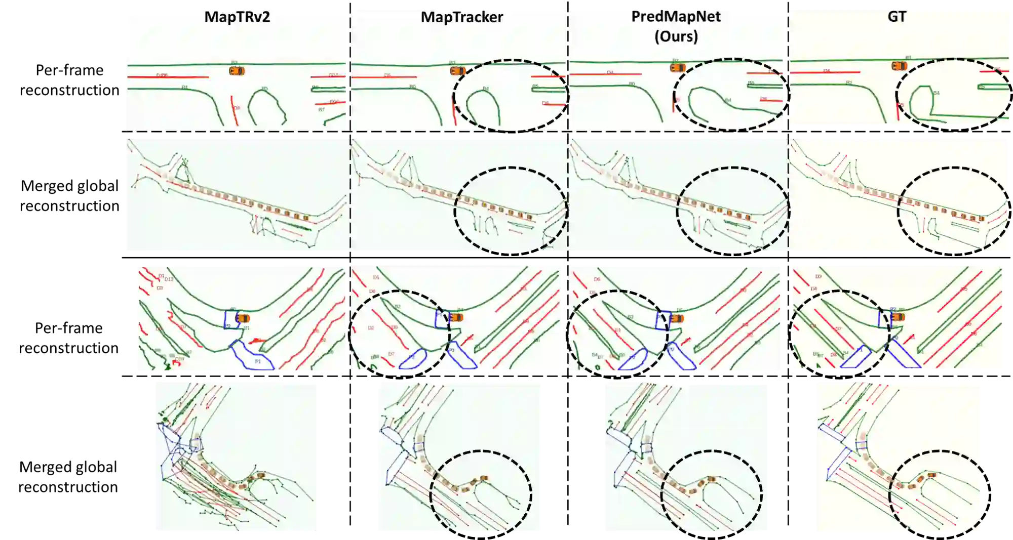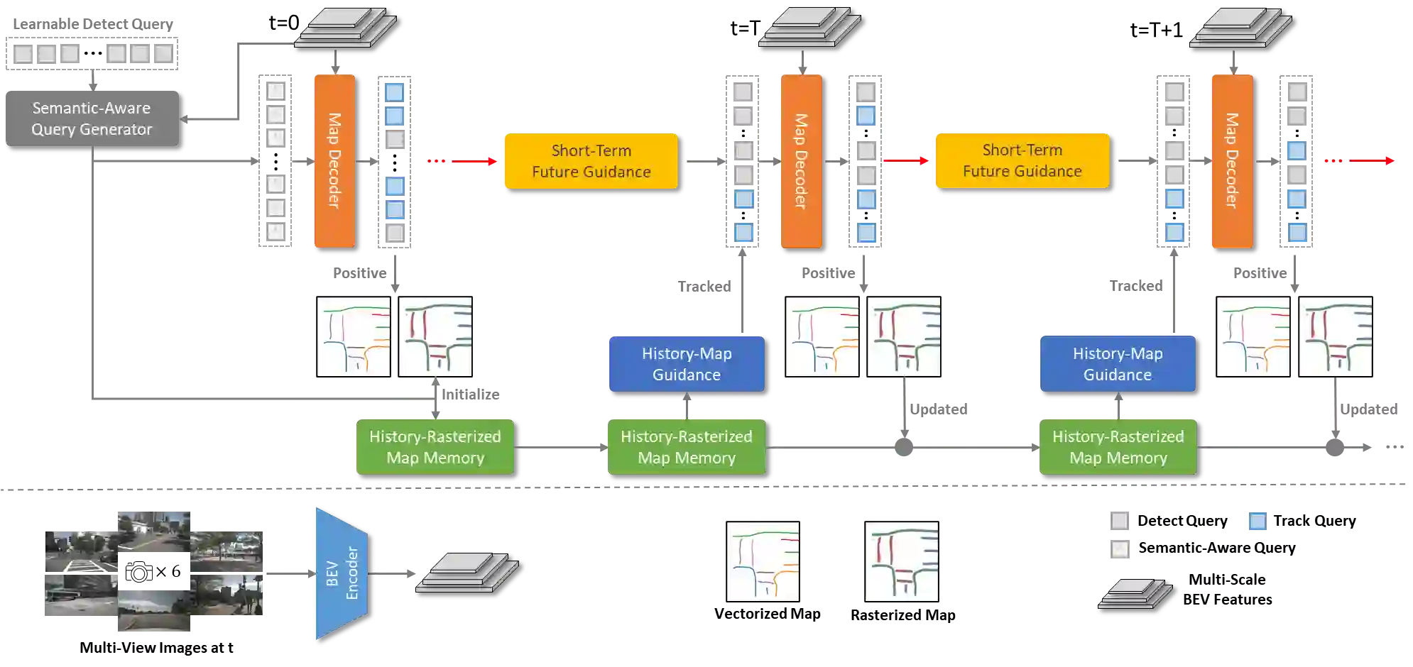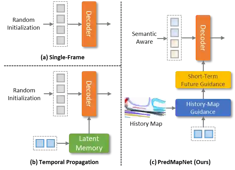 翻译:高精(HD)地图对自动驾驶至关重要,其提供的道路元素结构化表征可支持导航与规划。然而,现有基于查询的方法通常采用随机查询初始化并依赖隐式时序建模,导致在构建全局地图时出现时序不一致与不稳定的问题。为克服这些挑战,本文提出一种新颖的端到端框架,用于实现一致的在线高精矢量地图构建,该框架联合执行地图实例跟踪与短期预测。首先,我们提出一种语义感知查询生成器,通过空间对齐的语义掩码初始化查询,以全局捕获场景级上下文。接着,我们设计了一种历史栅格化地图记忆模块,用于存储每个被跟踪实例的细粒度实例级地图,从而提供显式的历史先验。随后,历史地图引导模块将栅格化地图信息整合至跟踪查询中,以提升时序连续性。最后,我们提出短期未来引导模块,基于存储的历史轨迹预测地图实例的即时运动。这些预测的未来位置作为跟踪实例的提示信息,进一步避免不合理预测并保持时序一致性。在 nuScenes 和 Argoverse2 数据集上的大量实验表明,本文所提方法在保证良好效率的同时,性能优于现有最优(SOTA)方法。