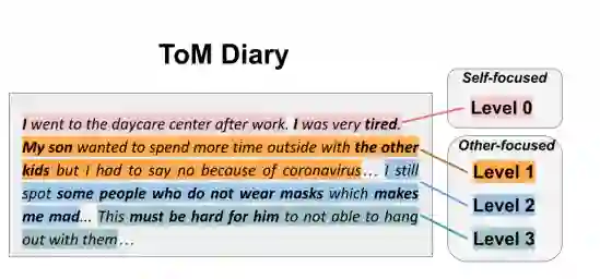 翻译:人类测算他人意图和思想的能力( ToM) 是人类测算他人意图和思想的能力, 是同情经历的一个基本部分。 我们在此提供了使用 NLP 模型来测量书面文本表达的 ToM 模型的框架 。 为此, 我们引入了 ToM-Dairy, 共18, 238 日记, 包含74, 014 韩元, 并附加了74, 014 韩元。 每本日记都由受过培训的心理学学生以 ToM 水平附加说明。 警告者首先根据是否提及其他人来区分日志: 以自我为焦点, 以其它人为焦点。 自重的句子示例是“我感觉良好 ” 。 其它重的句子被进一步分类为不同层次 。 我们测试了其他人的存在, 而没有推断他们的精神状态( 例如, 我看到一个人在街上行走)、 2 无法理解其他人的观点( 例如, 我无法理解他们为什么拒绝戴面具) 或3 成功理解其他人的观点( 我们最难理解他们选择的直觉方法 ) ( ) 以大的直观为模型/ 方向, 对于他们来说, 变动的模型, 更难于他们要继续运行 。