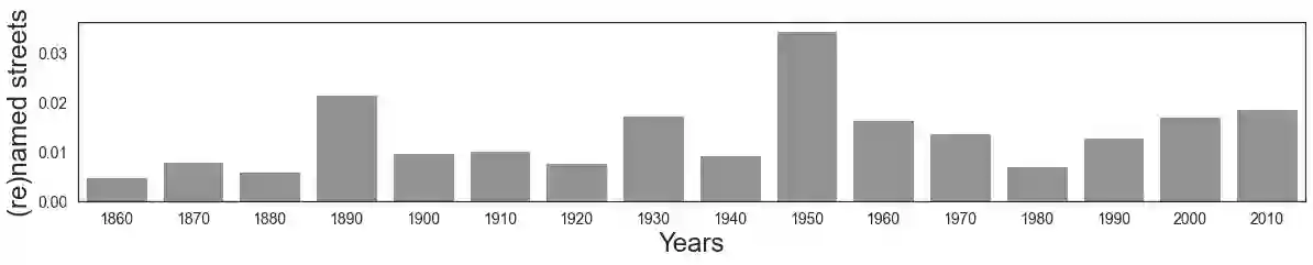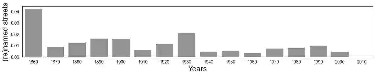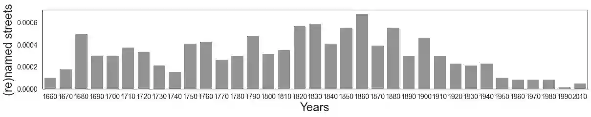 翻译:量化一个社会的价值体系很重要, 因为它能说明人们深为关心的是什么 -- 它能反映他们实际上是谁,更重要的是,他们愿意成为谁。 这种文化量化通常通过研究文学作品来完成。 但是,一个社会的价值体系很可能根据人们过去作出的决定和他们关心的事物所调解的决定而暗含地量化。 事实证明,这些决定中有一类是在普通环境中可见的: 它在街道名称中可见。 我们研究了巴黎、维也纳、伦敦和纽约城市4 932个荣誉街道的名称。 我们选择这四个城市是因为它们是20世纪西方世界重要的文化影响中心。 我们发现,街道名称在很大程度上反映了社会存在性别偏见的程度,这些职业被视为精英,以及城市受世界其他地方影响的程度。 以这种方式量化社会的价值体系承诺在数字人类学中提供新的方法信息; 使得各城市能够反思其过去,以便了解其未来; 并告知如何设计日常教育工具,以增进历史意识,从而在游戏中提高历史意识。