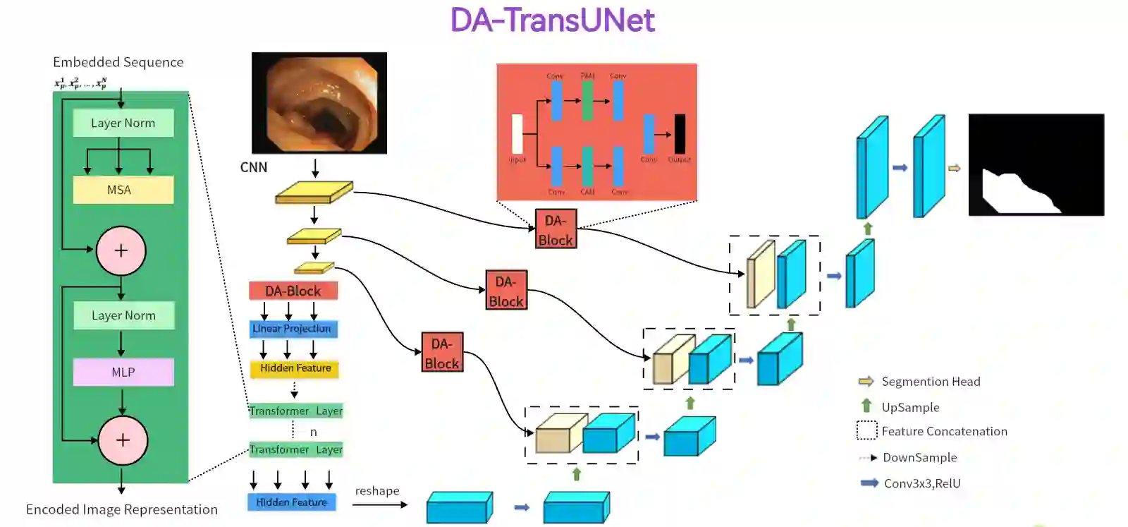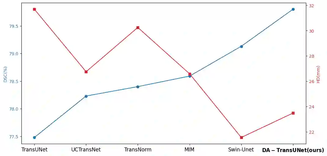 Accurate medical image segmentation is critical for disease quantification and treatment evaluation. While traditional Unet architectures and their transformer-integrated variants excel in automated segmentation tasks. However, they lack the ability to harness the intrinsic position and channel features of image. Existing models also struggle with parameter efficiency and computational complexity, often due to the extensive use of Transformers. To address these issues, this study proposes a novel deep medical image segmentation framework, called DA-TransUNet, aiming to integrate the Transformer and dual attention block(DA-Block) into the traditional U-shaped architecture. Unlike earlier transformer-based U-net models, DA-TransUNet utilizes Transformers and DA-Block to integrate not only global and local features, but also image-specific positional and channel features, improving the performance of medical image segmentation. By incorporating a DA-Block at the embedding layer and within each skip connection layer, we substantially enhance feature extraction capabilities and improve the efficiency of the encoder-decoder structure. DA-TransUNet demonstrates superior performance in medical image segmentation tasks, consistently outperforming state-of-the-art techniques across multiple datasets. In summary, DA-TransUNet offers a significant advancement in medical image segmentation, providing an effective and powerful alternative to existing techniques. Our architecture stands out for its ability to improve segmentation accuracy, thereby advancing the field of automated medical image diagnostics. The codes and parameters of our model will be publicly available at https://github.com/SUN-1024/DA-TransUnet.