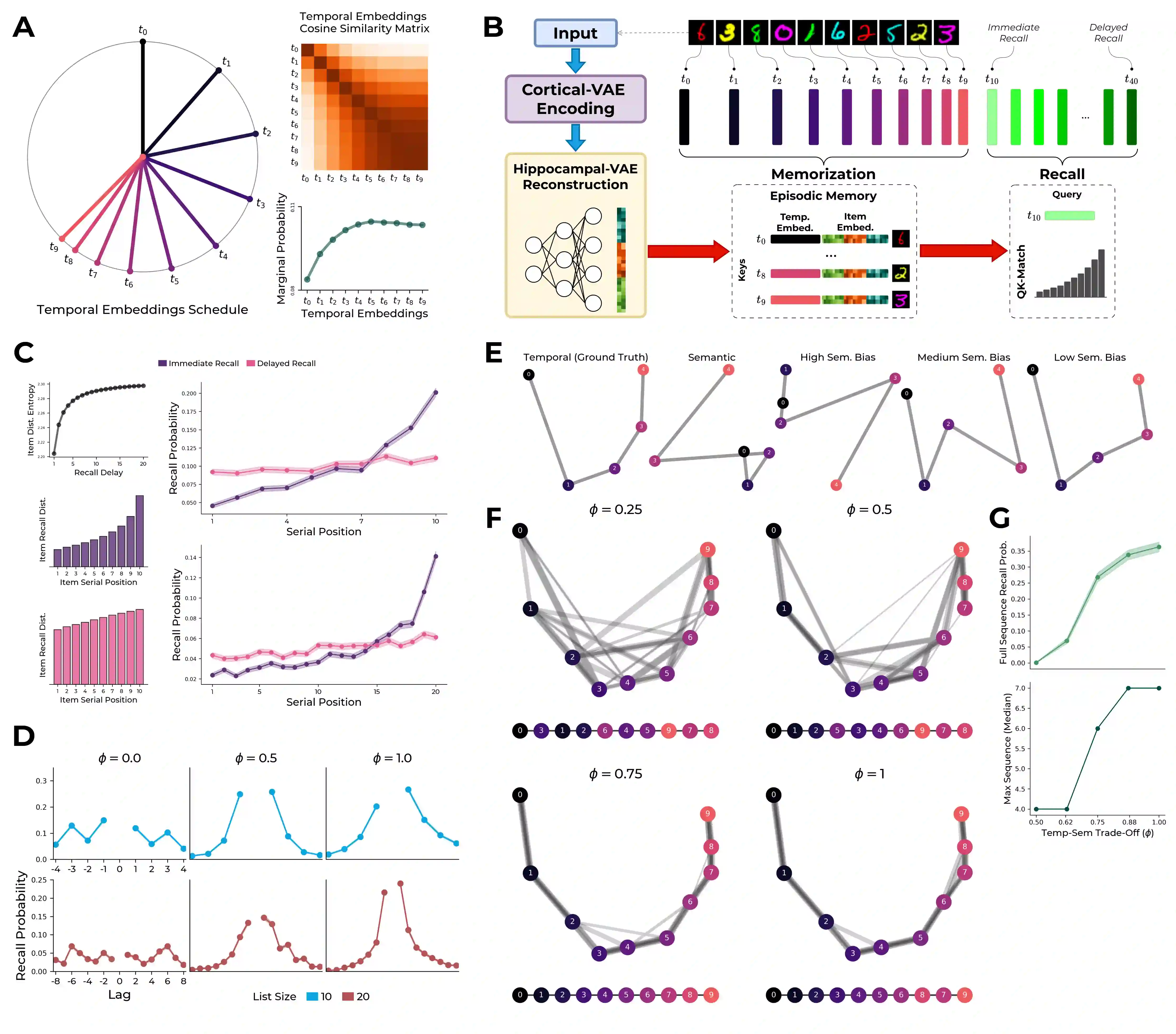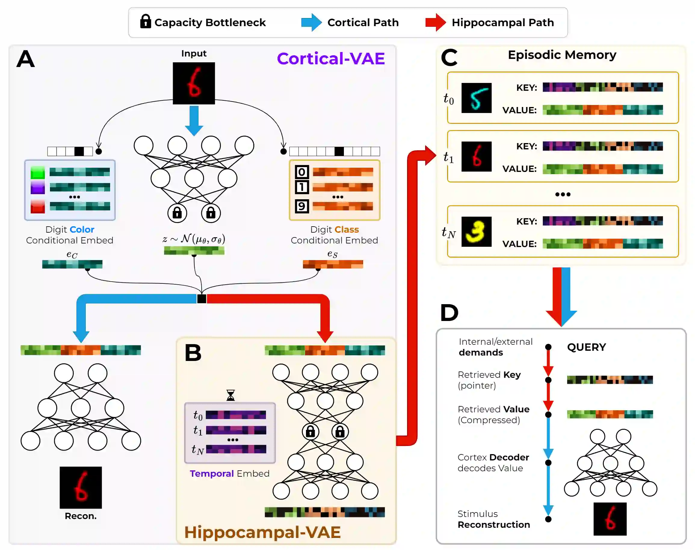 翻译:认知神经科学的一个核心挑战在于解释陈述性记忆的两种主要形式——通常分别与皮层和海马体处理相关的语义记忆和情景记忆——如何相互作用以支持学习、回忆和想象。尽管取得了显著进展,我们仍然缺乏一个统一的计算框架来共同解释语义和情景处理领域的核心经验现象。本文介绍了生成式情景-语义整合系统(GENESIS),这是一个计算模型,它将记忆形式化为两个有限容量的生成系统之间的交互:一个支持语义学习和泛化的皮层变分自编码器(Cortical-VAE),以及一个在检索增强生成(RAG)架构内支持情景编码和检索的海马变分自编码器(Hippocampal-VAE)。GENESIS复现了标志性的行为发现,包括语义记忆中的泛化、识别、序列回忆效应以及情景记忆中基于要旨的扭曲和建设性的情景模拟,同时捕捉了它们之间的动态交互。该模型阐明了容量限制如何塑造经验的保真度和可记忆性,语义处理如何引入情景回忆中的系统性扭曲,以及情景回放如何重组先前的经验。总之,这些结果为将记忆理解为一个主动的、建设性的、资源受限的过程提供了原理性解释。因此,GENESIS推进了一个统一的理论框架,桥接了语义记忆和情景记忆,为人类认知的生成基础提供了新的见解。