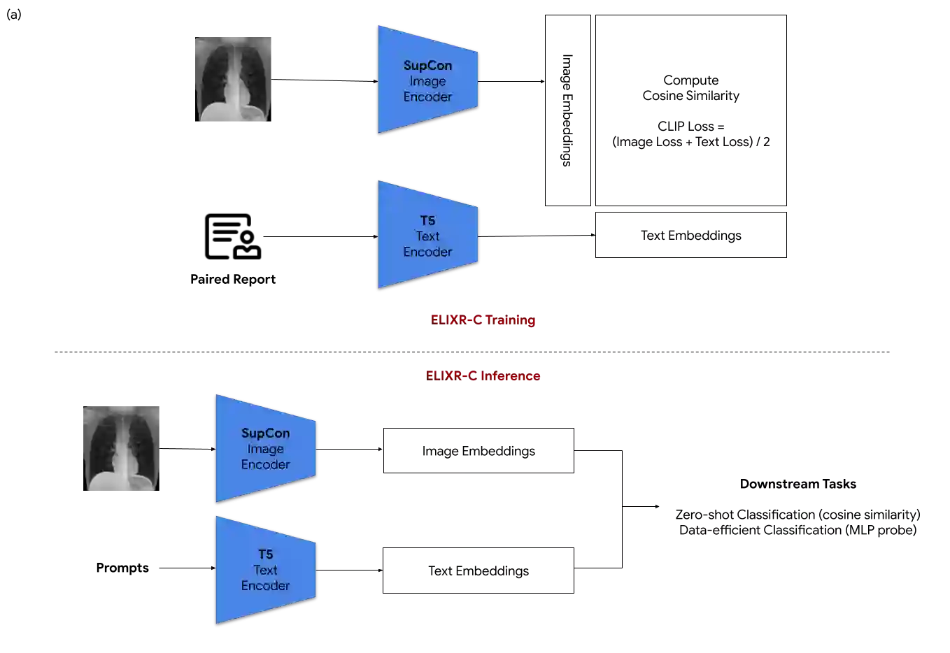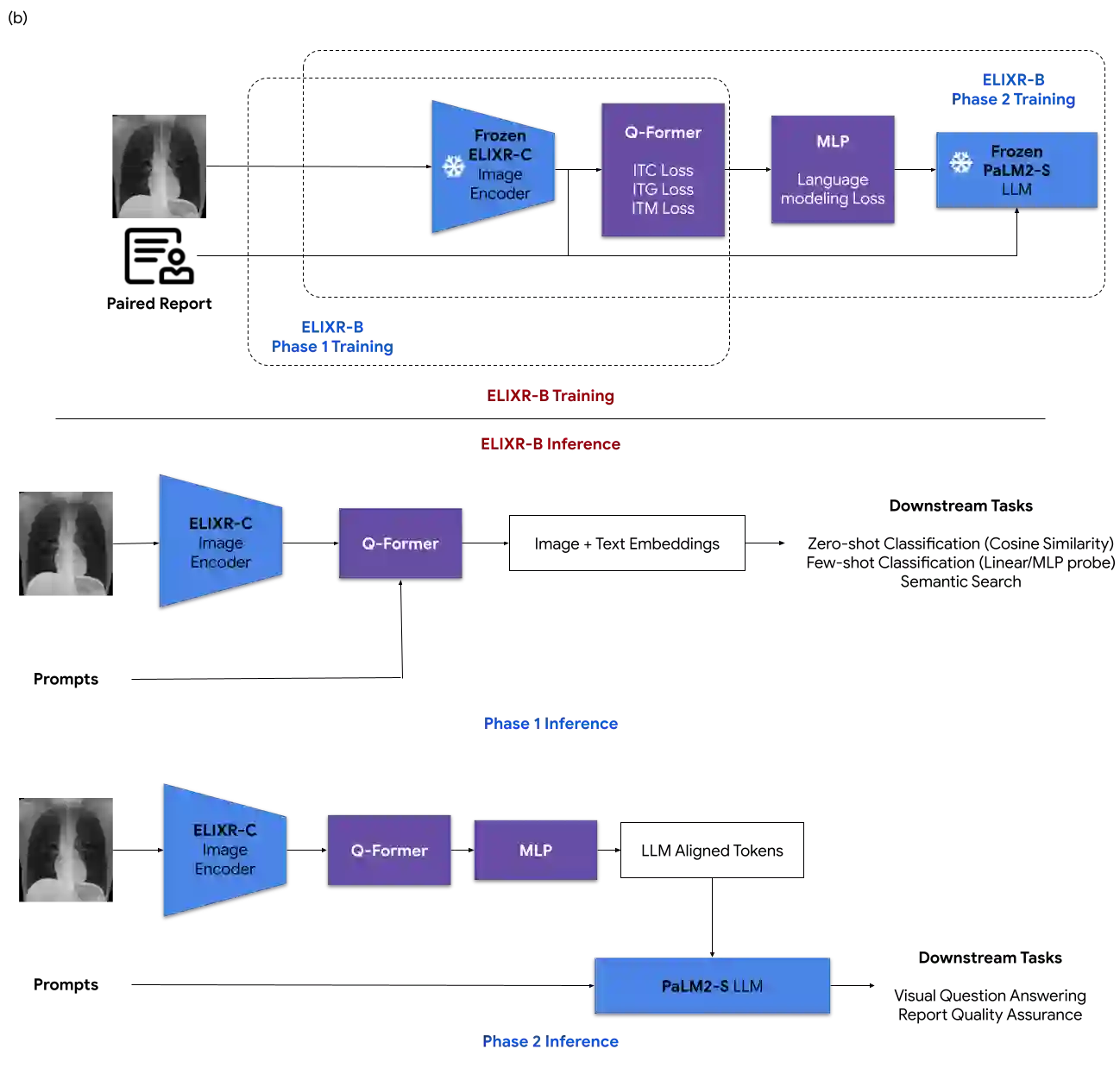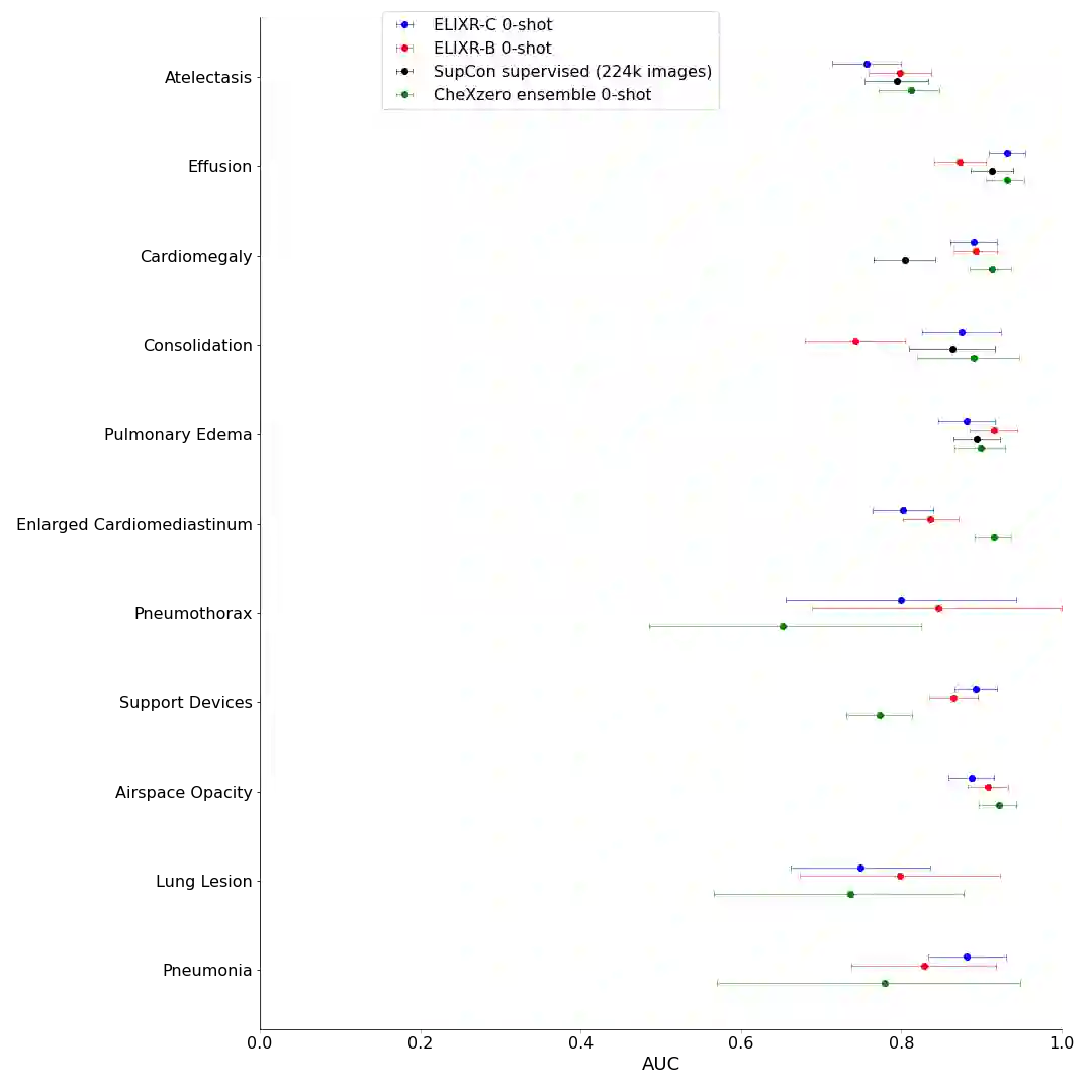 Our approach, which we call Embeddings for Language/Image-aligned X-Rays, or ELIXR, leverages a language-aligned image encoder combined or grafted onto a fixed LLM, PaLM 2, to perform a broad range of tasks. We train this lightweight adapter architecture using images paired with corresponding free-text radiology reports from the MIMIC-CXR dataset. ELIXR achieved state-of-the-art performance on zero-shot chest X-ray (CXR) classification (mean AUC of 0.850 across 13 findings), data-efficient CXR classification (mean AUCs of 0.893 and 0.898 across five findings (atelectasis, cardiomegaly, consolidation, pleural effusion, and pulmonary edema) for 1% (~2,200 images) and 10% (~22,000 images) training data), and semantic search (0.76 normalized discounted cumulative gain (NDCG) across nineteen queries, including perfect retrieval on twelve of them). Compared to existing data-efficient methods including supervised contrastive learning (SupCon), ELIXR required two orders of magnitude less data to reach similar performance. ELIXR also showed promise on CXR vision-language tasks, demonstrating overall accuracies of 58.7% and 62.5% on visual question answering and report quality assurance tasks, respectively. These results suggest that ELIXR is a robust and versatile approach to CXR AI.