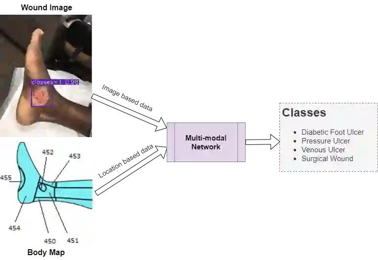 The global burden of acute and chronic wounds presents a compelling case for enhancing wound classification methods, a vital step in diagnosing and determining optimal treatments. Recognizing this need, we introduce an innovative multi-modal network based on a deep convolutional neural network for categorizing wounds into four categories: diabetic, pressure, surgical, and venous ulcers. Our multi-modal network uses wound images and their corresponding body locations for more precise classification. A unique aspect of our methodology is incorporating a body map system that facilitates accurate wound location tagging, improving upon traditional wound image classification techniques. A distinctive feature of our approach is the integration of models such as VGG16, ResNet152, and EfficientNet within a novel architecture. This architecture includes elements like spatial and channel-wise Squeeze-and-Excitation modules, Axial Attention, and an Adaptive Gated Multi-Layer Perceptron, providing a robust foundation for classification. Our multi-modal network was trained and evaluated on two distinct datasets comprising relevant images and corresponding location information. Notably, our proposed network outperformed traditional methods, reaching an accuracy range of 74.79% to 100% for Region of Interest (ROI) without location classifications, 73.98% to 100% for ROI with location classifications, and 78.10% to 100% for whole image classifications. This marks a significant enhancement over previously reported performance metrics in the literature. Our results indicate the potential of our multi-modal network as an effective decision-support tool for wound image classification, paving the way for its application in various clinical contexts.