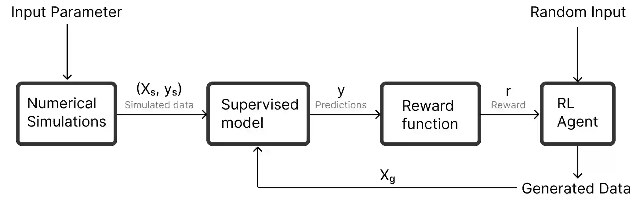 In this paper, we present a machine learning-based data generator framework tailored to aid researchers who utilize simulations to examine various physical systems or processes. High computational costs and the resulting limited data often pose significant challenges to gaining insights into these systems or processes. Our approach involves a two-step process: initially, we train a supervised predictive model using a limited simulated dataset to predict simulation outcomes. Subsequently, a reinforcement learning agent is trained to generate accurate, simulation-like data by leveraging the supervised model. With this framework, researchers can generate more accurate data and know the outcomes without running high computational simulations, which enables them to explore the parameter space more efficiently and gain deeper insights into physical systems or processes. We demonstrate the effectiveness of the proposed framework by applying it to two case studies, one focusing on earthquake rupture physics and the other on new material development.