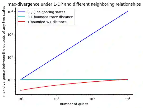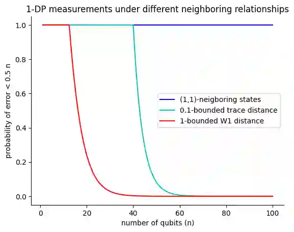 Differential privacy is a widely used notion of security that enables the processing of sensitive information. In short, differentially private algorithms map "neighbouring" inputs to close output distributions. Prior work proposed several quantum extensions of differential privacy, each of them built on substantially different notions of neighbouring quantum states. In this paper, we propose a novel and general definition of neighbouring quantum states. We demonstrate that this definition captures the underlying structure of quantum encodings and can be used to provide exponentially tighter privacy guarantees for quantum measurements. Our approach combines the addition of classical and quantum noise and is motivated by the noisy nature of near-term quantum devices. Moreover, we also investigate an alternative setting where we are provided with multiple copies of the input state. In this case, differential privacy can be ensured with little loss in accuracy combining concentration of measure and noise-adding mechanisms. En route, we prove the advanced joint convexity of the quantum hockey-stick divergence and we demonstrate how this result can be applied to quantum differential privacy. Finally, we complement our theoretical findings with an empirical estimation of the certified adversarial robustness ensured by differentially private measurements.