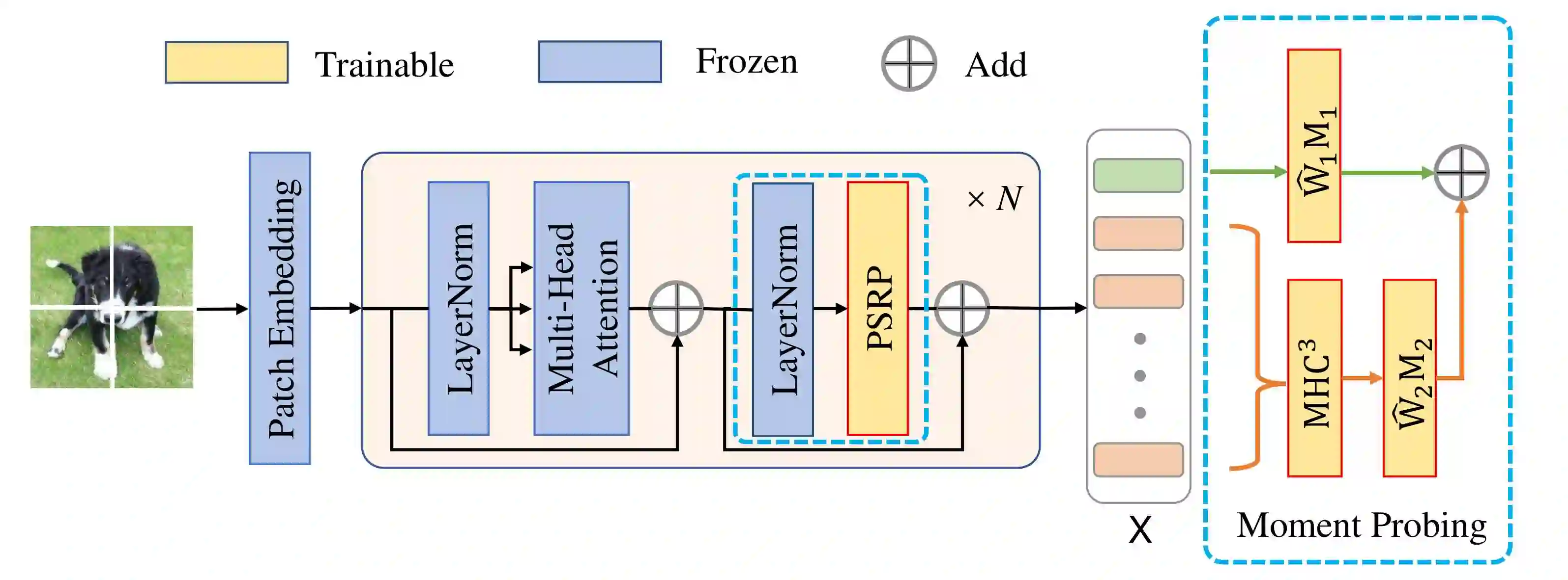 Recently, efficient fine-tuning of large-scale pre-trained models has attracted increasing research interests, where linear probing (LP) as a fundamental module is involved in exploiting the final representations for task-dependent classification. However, most of the existing methods focus on how to effectively introduce a few of learnable parameters, and little work pays attention to the commonly used LP module. In this paper, we propose a novel Moment Probing (MP) method to further explore the potential of LP. Distinguished from LP which builds a linear classification head based on the mean of final features (e.g., word tokens for ViT) or classification tokens, our MP performs a linear classifier on feature distribution, which provides the stronger representation ability by exploiting richer statistical information inherent in features. Specifically, we represent feature distribution by its characteristic function, which is efficiently approximated by using first- and second-order moments of features. Furthermore, we propose a multi-head convolutional cross-covariance (MHC$^3$) to compute second-order moments in an efficient and effective manner. By considering that MP could affect feature learning, we introduce a partially shared module to learn two recalibrating parameters (PSRP) for backbones based on MP, namely MP$_{+}$. Extensive experiments on ten benchmarks using various models show that our MP significantly outperforms LP and is competitive with counterparts at less training cost, while our MP$_{+}$ achieves state-of-the-art performance.