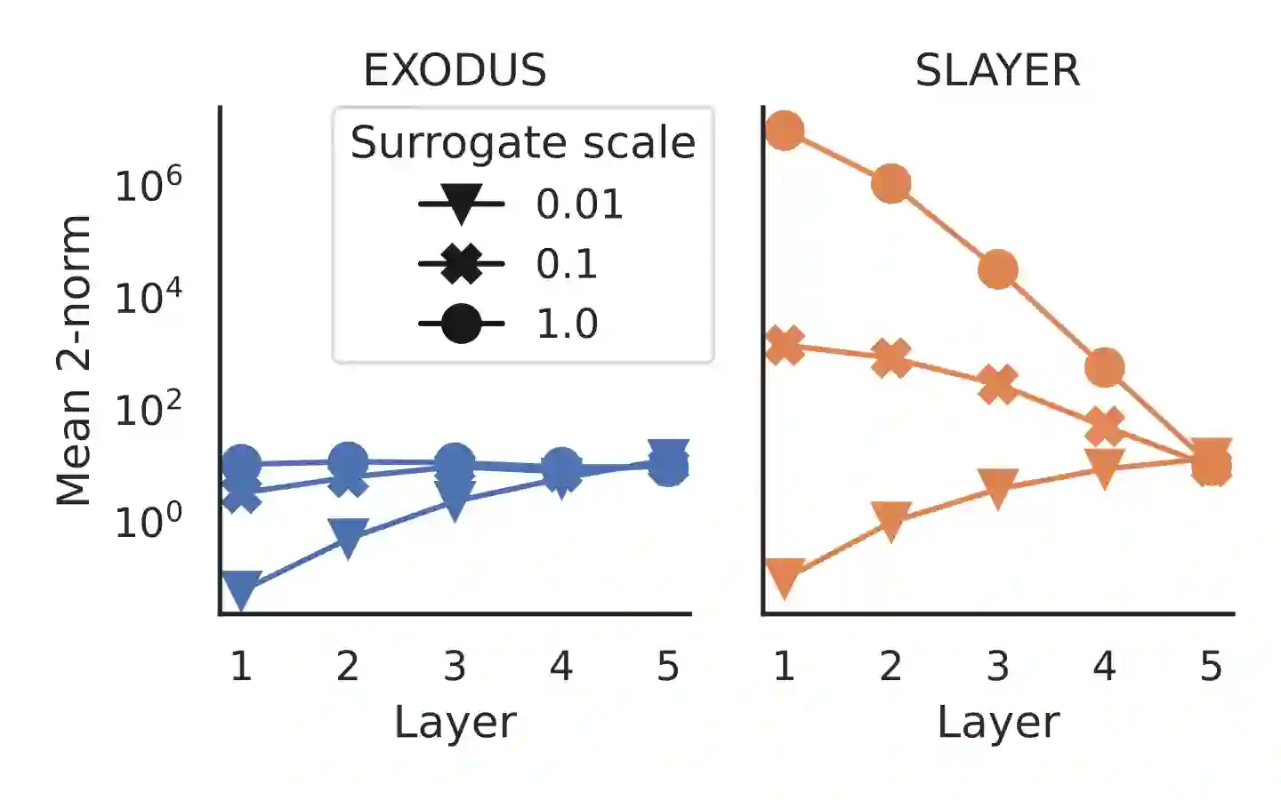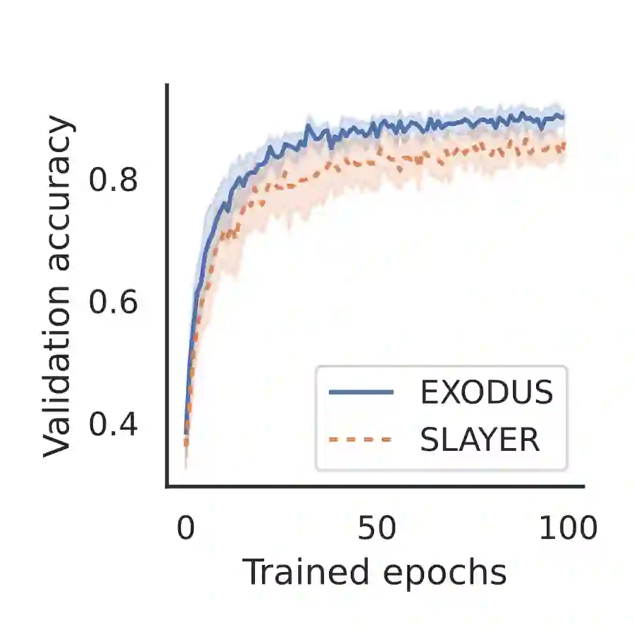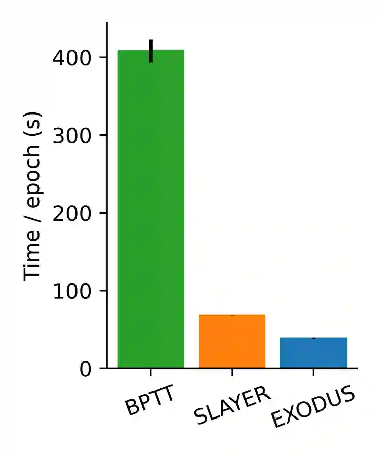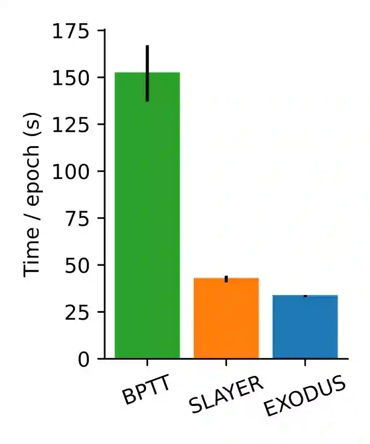 翻译:Spiking神经网络(SNNS)在能源效率极为重要的机器学习任务中正在获得显著的牵引力。然而,利用最先进的后反向分析时间(BBTT)对此类网络进行培训非常耗时。 Shrestha和Orchard [2018] 先前的工作使用了高效的GPU-加速后向分析算法,称为SLAYER,该算法大大加快了培训。 然而,SLAYER在计算梯度时没有考虑到神经重置机制,而我们认为这是数字不稳定的根源。为了抵消这一点,SLAYER在各层中引入了梯度超参数,这需要手工调整。在本文中,(i)我们修改SLAYER并设计了一个称为EXODUS的算法,该算出神经重置机制,并应用隐性函数理论来计算正确的梯度(相当于BPTT的算法),(ii)我们在计算梯度时没有考虑到神经重重重的重置机制,因此,我们不需要在梯度上进行梯度的缩缩缩缩,因此需要跨度,在各层次上设置上,从而降低SRAY(SUR三)在模拟中可以进行精确的计算。