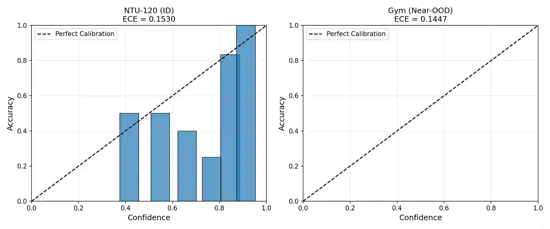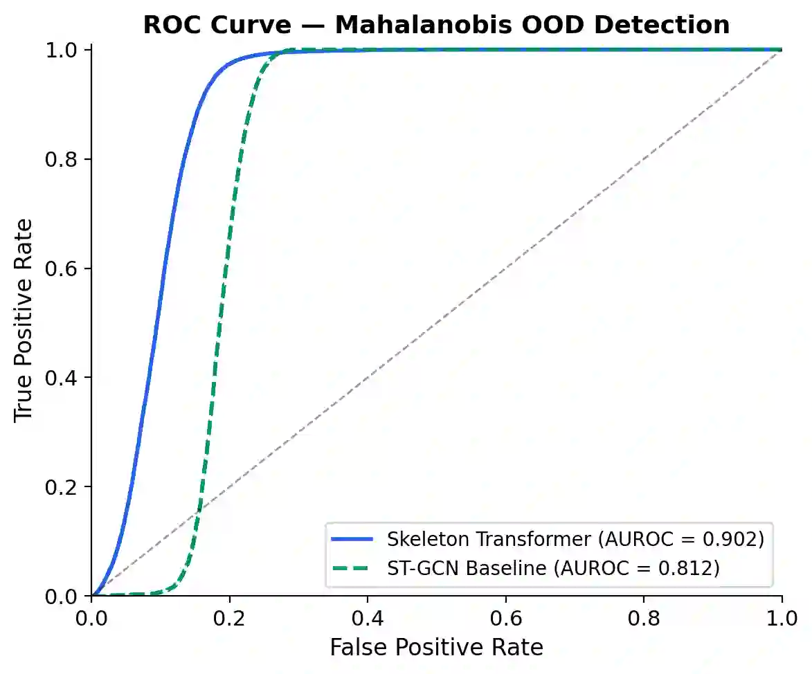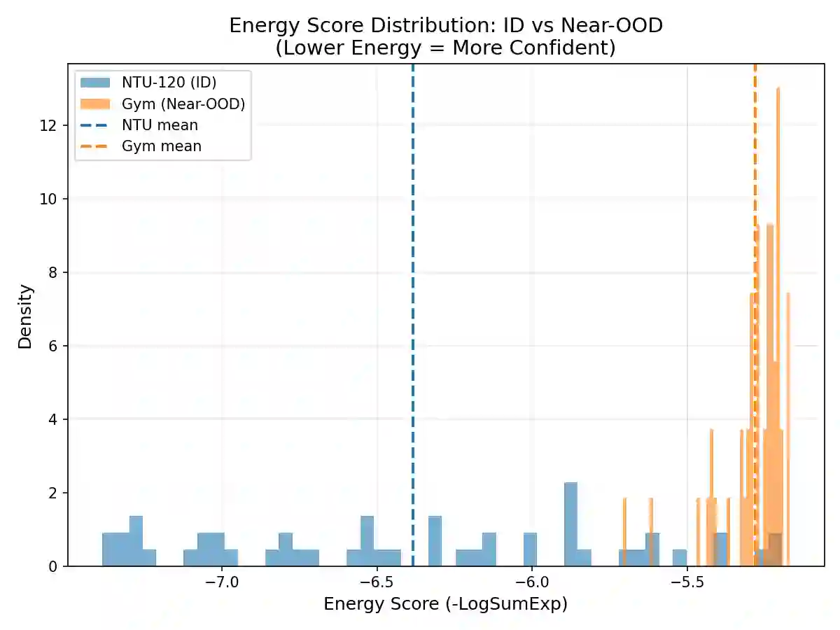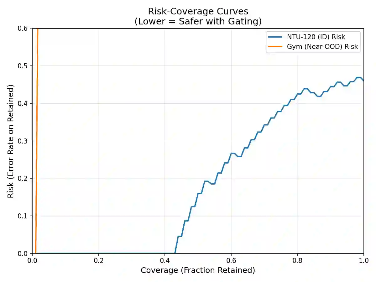 翻译:实际部署差距——从受控的多视角三维骨架捕捉过渡到无约束的单目二维姿态估计——引入了一种复合领域偏移,其安全影响仍严重缺乏研究。我们通过新颖的Gym2D数据集(风格/视角偏移)和UCF101数据集(语义偏移)对这种严重领域偏移进行了系统研究。我们的Skeleton Transformer在NTU-120数据集上实现了63.2%的跨主体准确率,但在零样本迁移至健身房领域时骤降至1.6%,在UCF101上仅为1.16%。关键的是,我们证明了高分布外检测AUROC并不能保证安全的选择性分类。标准不确定性方法未能检测到这种性能下降:模型在两种OOD数据集上即使覆盖率为50%时,仍以99.6%的风险保持自信的错误预测。虽然基于能量的评分(AUROC≥0.91)和马氏距离提供了可靠的分布检测信号,但在实际决策时,这种高AUROC分数与较差的风险-覆盖率行为共存。轻量级微调的门控机制恢复了校准能力并实现了优雅的弃权决策,显著降低了自信错误预测的比例。我们的研究挑战了标准部署假设,为语义和几何骨架识别部署提供了原则性的安全分析。