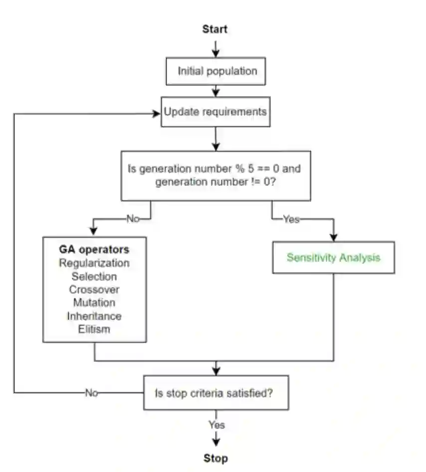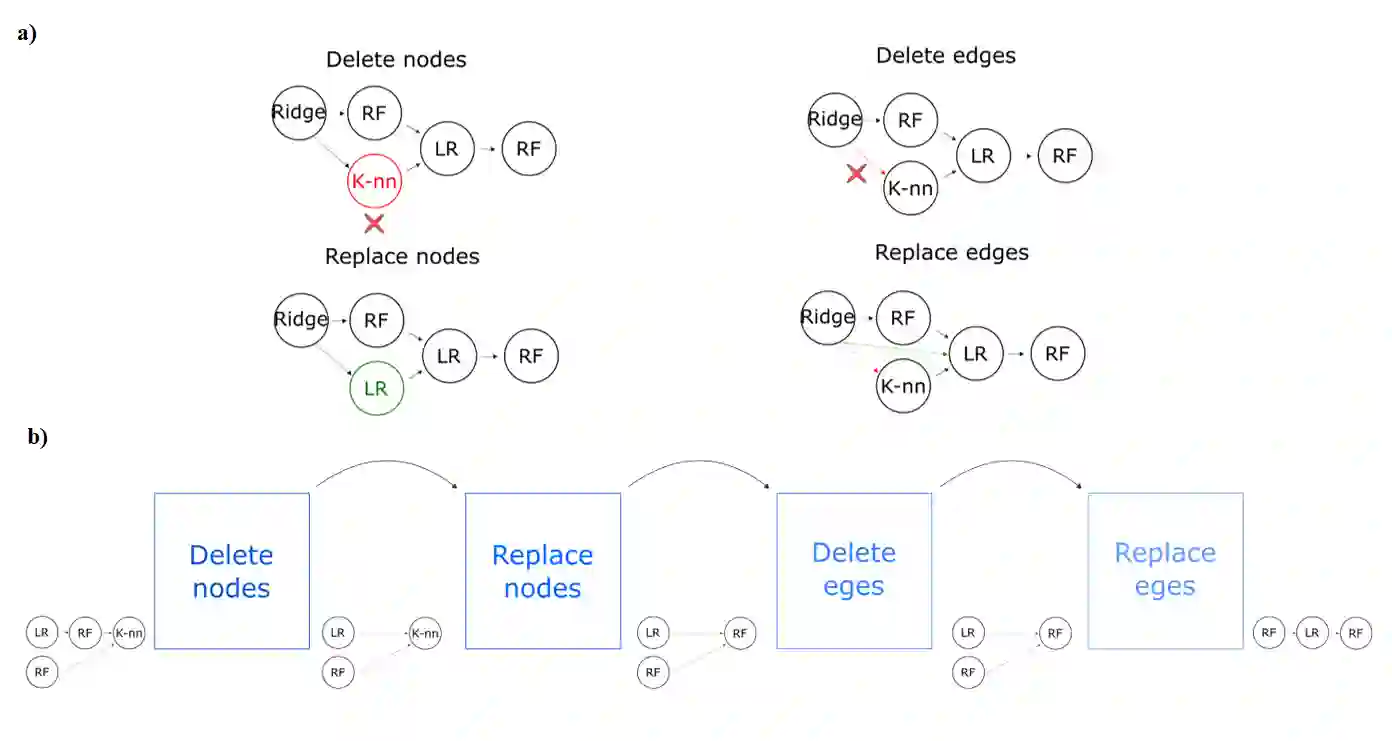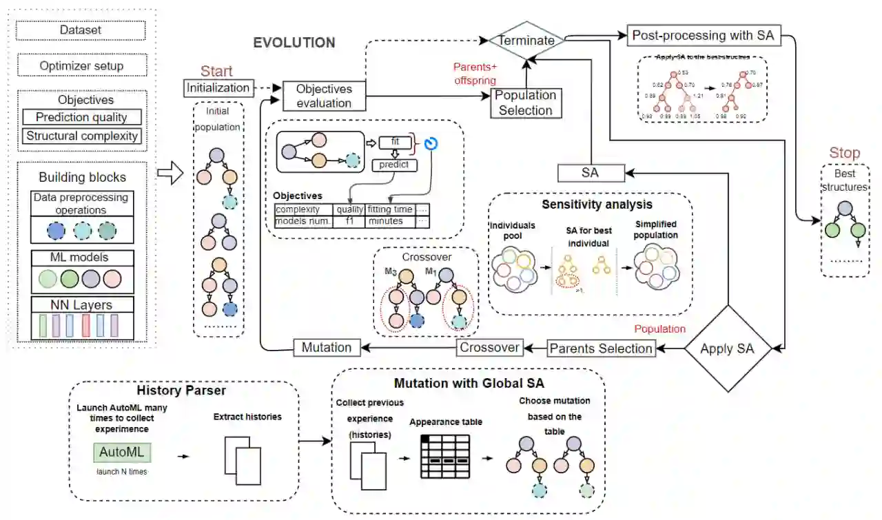 Automated machine learning (AutoML) systems propose an end-to-end solution to a given machine learning problem, creating either fixed or flexible pipelines. Fixed pipelines are task independent constructs: their general composition remains the same, regardless of the data. In contrast, the structure of flexible pipelines varies depending on the input, making them finely tailored to individual tasks. However, flexible pipelines can be structurally overcomplicated and have poor explainability. We propose the EVOSA approach that compensates for the negative points of flexible pipelines by incorporating a sensitivity analysis which increases the robustness and interpretability of the flexible solutions. EVOSA quantitatively estimates positive and negative impact of an edge or a node on a pipeline graph, and feeds this information to the evolutionary AutoML optimizer. The correctness and efficiency of EVOSA was validated in tabular, multimodal and computer vision tasks, suggesting generalizability of the proposed approach across domains.