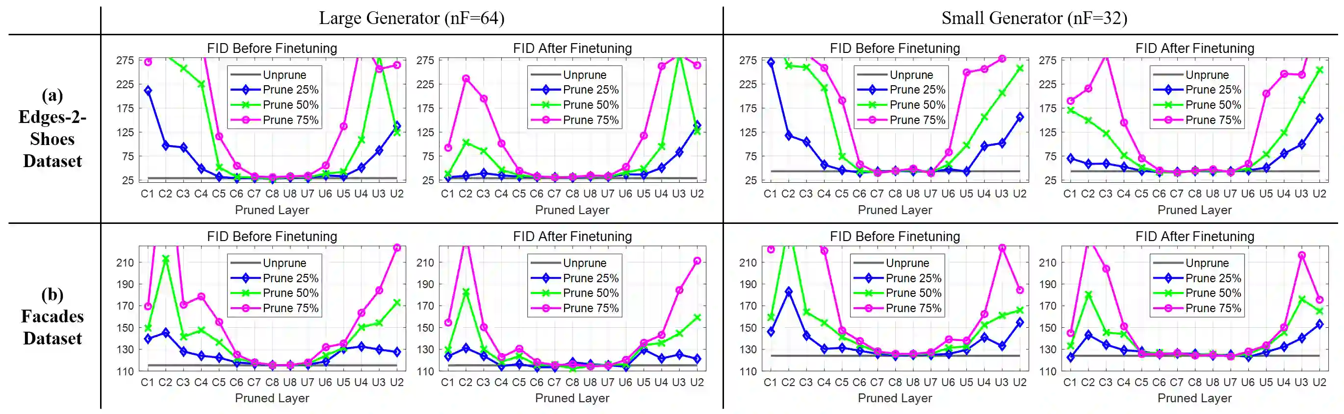 Pruning effectively compresses overparameterized models. Despite the success of pruning methods for discriminative models, applying them for generative models has been relatively rarely approached. This study conducts structured pruning on U-Net generators of conditional GANs. A per-layer sensitivity analysis confirms that many unnecessary filters exist in the innermost layers near the bottleneck and can be substantially pruned. Based on this observation, we prune these filters from multiple inner layers or suggest alternative architectures by completely eliminating the layers. We evaluate our approach with Pix2Pix for image-to-image translation and Wav2Lip for speech-driven talking face generation. Our method outperforms global pruning baselines, demonstrating the importance of properly considering where to prune for U-Net generators.