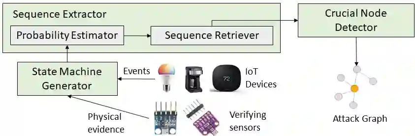 翻译:随着在IoT环境中触发行动平台的出现和快速发展,由IoT装置相互作用造成的安全脆弱性更加普遍。在一个装置上发生的事件触发了另一个装置的动作,这最终可能有助于在网络中产生一系列事件。相反,利用连锁效应来破坏IoT装置,并仅仅通过向链中注入恶意事件来触发人们感兴趣的行动。为了解决触发行动情景造成的安全脆弱性,现有的研究工作侧重于验证装置的安全特性,或根据装置上的物理指纹核查某些事件的发生情况。我们建议使用IoTMonitor,一个安全分析系统,通过观察传感器收集的一系列实物证据,以最大的概率辨别事件发生的潜在链。我们使用 Baum-Welch 算法来估计转移和排放概率,以及Vitebi 算法来辨别事件序列。然后我们可以确定触发行动序列中的关键节点,这些节点的妥协使攻击者能够达到最终目标。我们在PEEVES数据集中设计的系统实验结果显示,我们能够从攻击的观察中重建事件的高度序列。